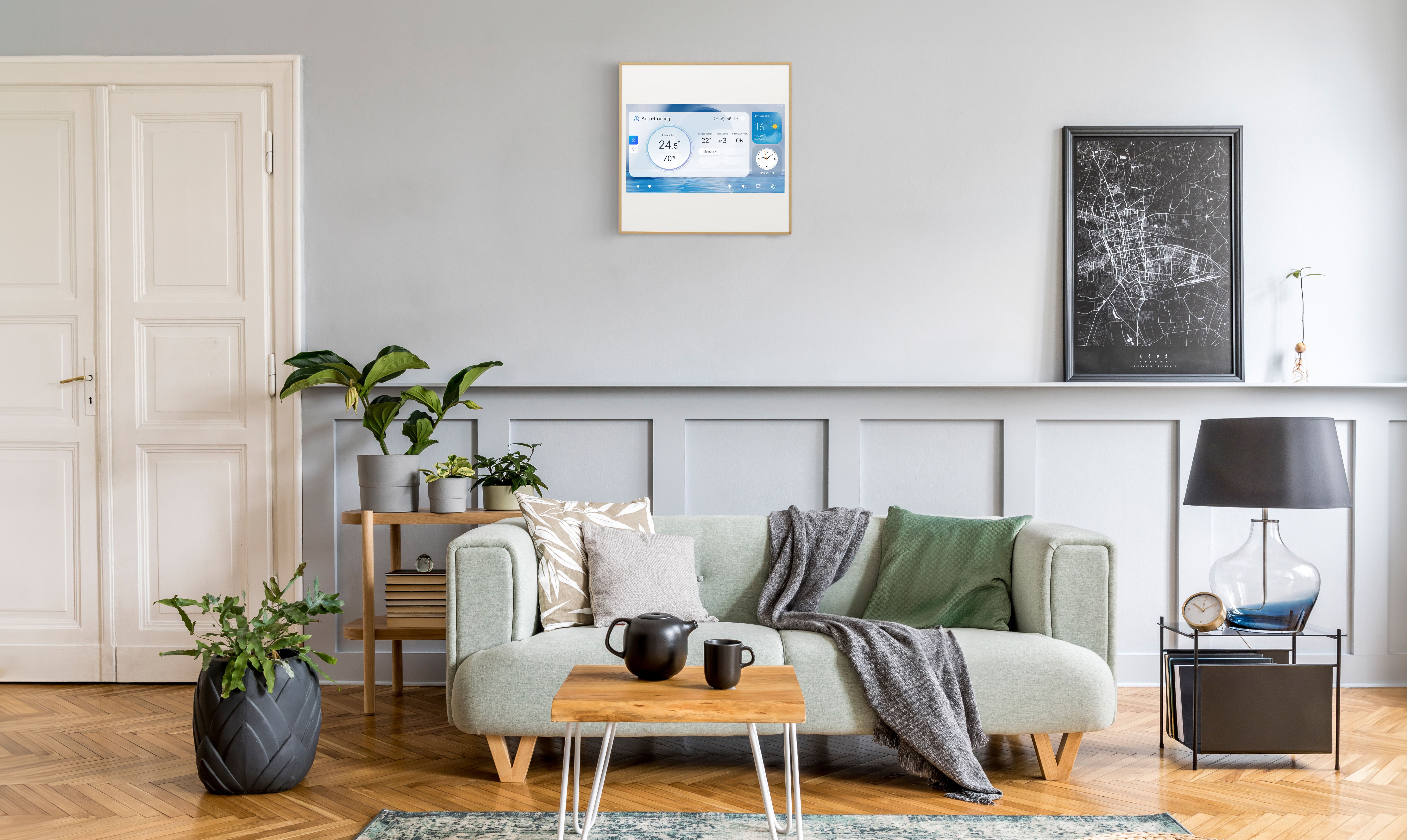 Quando non utilizzato per la riproduzione di foto o video, il display offre una comoda dashboard con informazioni utili come il meteo, l’orario e la gestione delle impostazioni del dispositivo come la modalità operativa, la temperatura e livello di umidità in ambiente e il monitoraggio dei consumi energetici.