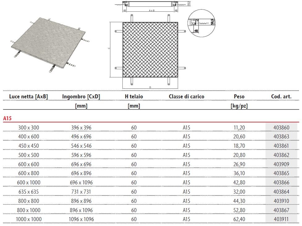 I chiusini tecnici ACO Access Covers sono dispositivi di copertura progettati per garantire un accesso sicuro e funzionale alle infrastrutture interrate, facilitando ispezione e manutenzione di reti idriche, fognarie, canalizzazioni, locali tecnici e impianti vari. Realizzati in materiali ad alta resistenza come acciaio inox AISI 304 (o AISI 316 su richiesta), acciaio zincato a caldo e leghe di alluminio, si distinguono per durabilità, resistenza a sollecitazioni meccaniche, agenti atmosferici e sostanze chimiche. La progettazione conforme alle normative EN 124 e EN 1253-4 assicura prestazioni strutturali in classi di carico da A15 a C250, mentre la certificazione FACTA attesta qualità e sicurezza secondo gli standard internazionali. I chiusini ACO sono composti da un telaio perimetrale e un coperchio removibile dotato di guarnizioni per la tenuta idraulica e odorifera, oltre a sistemi di chiusura con chiavi e fissaggi di sicurezza. Adatti per ambienti interni ed esterni, trovano applicazione in ambiti pedonali, aree carrabili, zone industriali, commerciali e residenziali, banchine, stazioni ferroviarie e contesti ad alta frequentazione. Il design modulare e la semplicità di installazione, movimentazione e manutenzione li rendono una soluzione efficiente e affidabile. Nello specifico, i chiusini in acciaio inox offrono elevata resistenza alla corrosione e all’usura, caratteristiche igieniche e facilità di pulizia, risultando ideali per ambienti sanitari o ad alta richiesta estetica e strutturale. I chiusini in acciaio zincato a caldo, grazie al rivestimento protettivo anticorrosione, sono particolarmente indicati per contesti esterni soggetti a intemperie e traffico leggero. Infine, i chiusini in alluminio combinano leggerezza, resistenza e versatilità estetica, garantendo buona durabilità anche in ambienti salini e costieri.