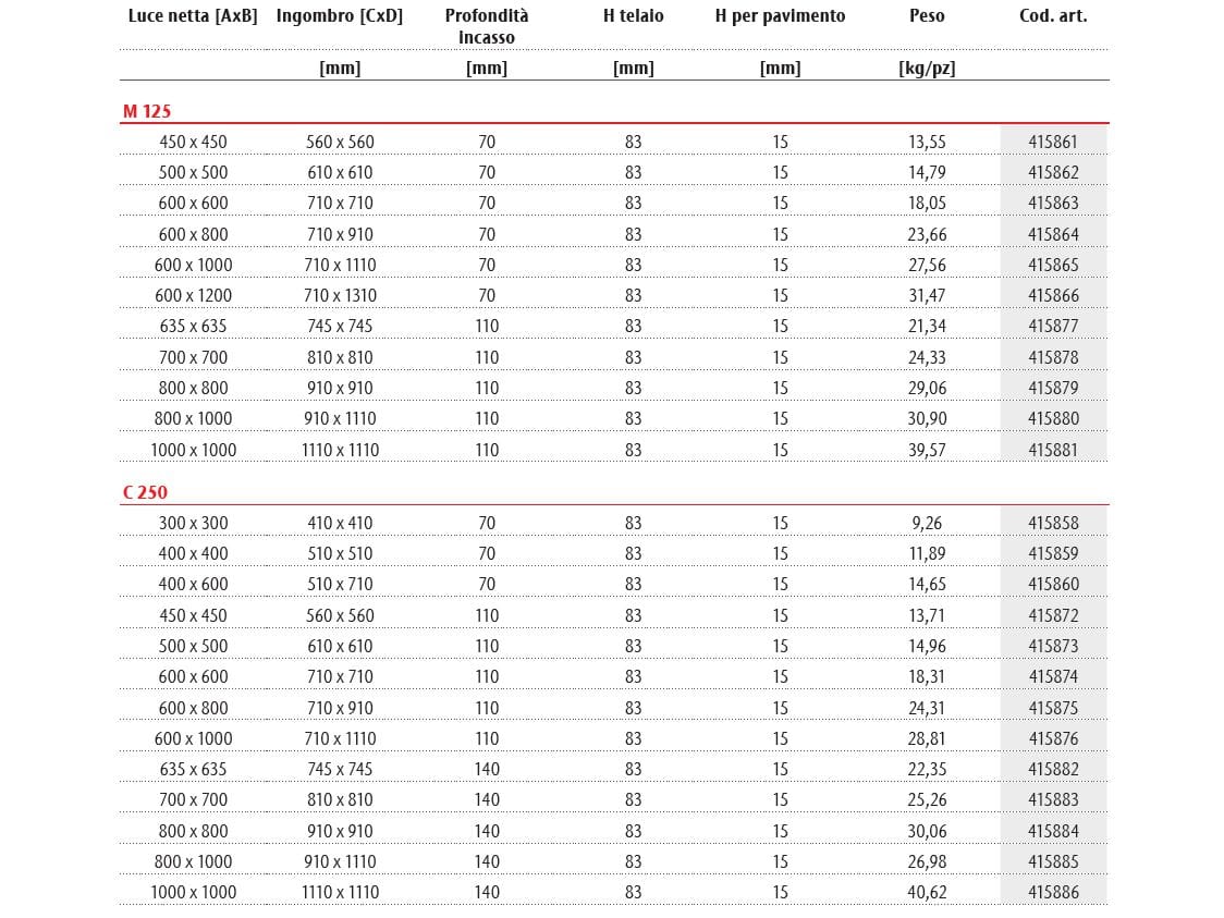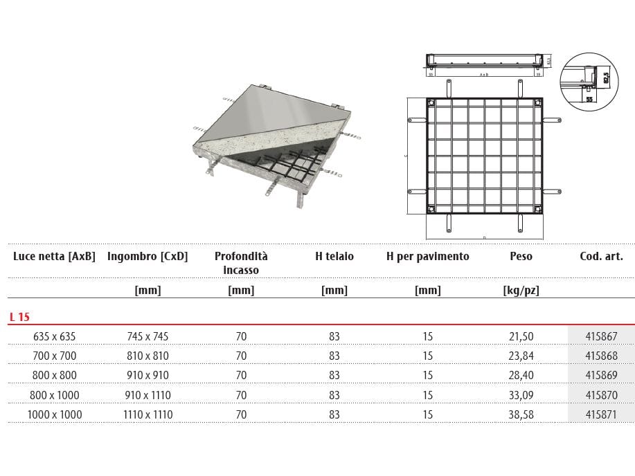 - Indicato per l'uso all'interno di edifici o in ambienti circostanti, dov'è richiesto un elevato livello di finiture. Adatto a pavimenti di spessore fino a 15 mm. Il chiusino dev'essere riempito con calcestruzzo di qualità necessaria a conseguire classe di carico dichiarata
