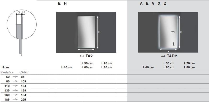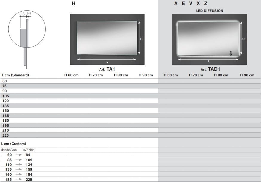 Argento - Specchi extrachiaro 8 mm bordo becco di civetta angoli stondati (r 10mm) con e senza illuminazione a led, trasformatore 220/12v e interruttore touch-light, completi di telaio.