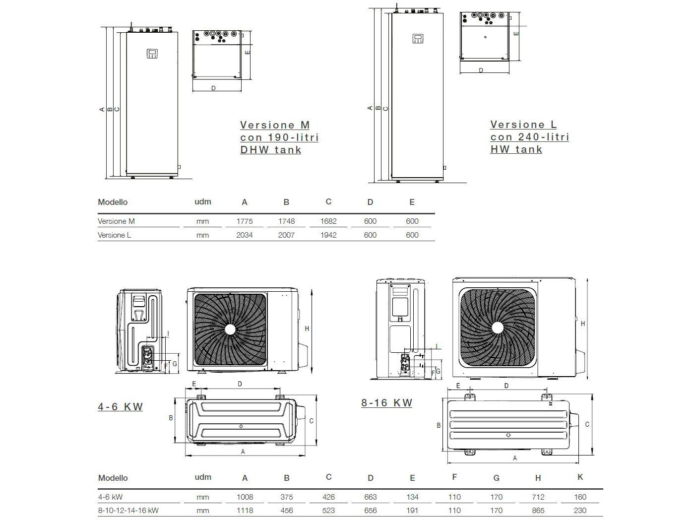 - Nell'unità interna trovano invece posto i componenti principali del sistema idronico, compreso un bollitore di 190l o 240l a elevata superficie per la produzione dell'acqua calda sanitaria