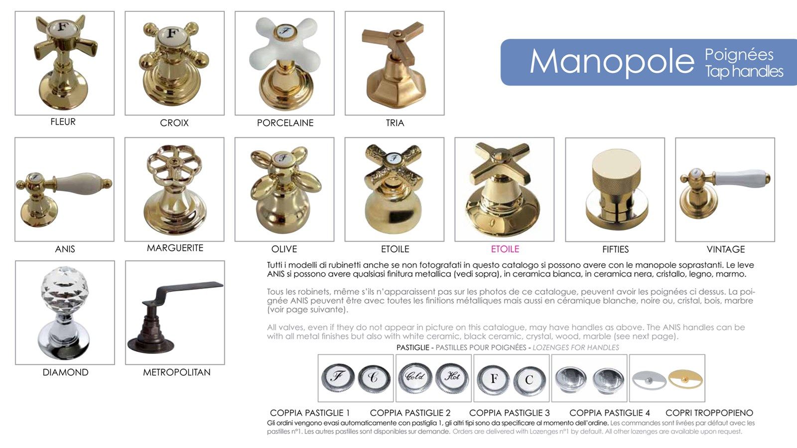 Grande scelta di rubinetti classici in ottone di alta gamma per lavabo, con 1, 2 o 3 fori, batterie o miscelatori. Numerose finiture metalliche possibili. Diverse maniglie disponibili.