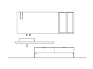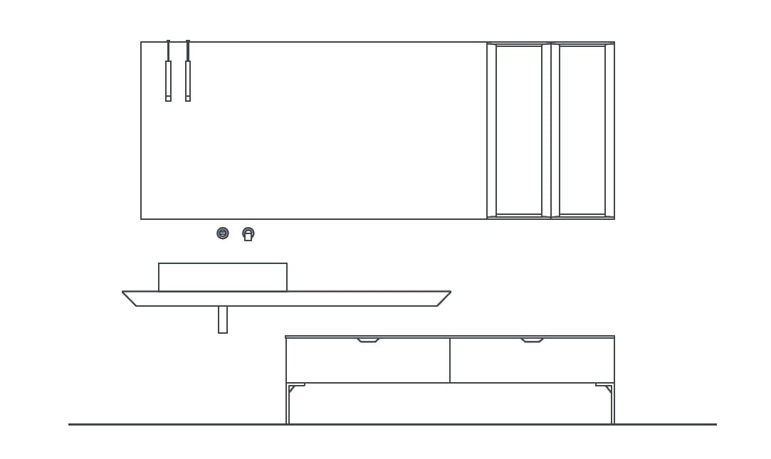 Combinazioni di materiali e di colori per una composizione minimale ed elegante. La tavola in legno massello Edon Carbon con il lavabo in Gres Pietra Piasentina Grigio Opaco è perfettamente in sintonia con i frontali del mobile in appoggio su piedini in metallo. La composizione è completata dal pensile con ante in alluminio di colore nero opaco con vetro fumé.