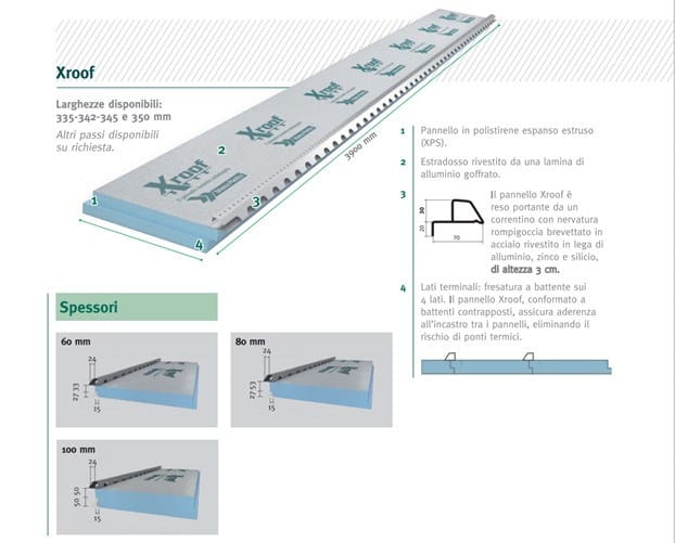 Il pannello termoisolante Xroof in polistirene espanso estruso è rivestito nella sua parte superiore con una lamina di alluminio goffrato. Nel pannello è inserito un correntino in acciaio rivestito in lega alluminio, zinco e silicio, nervato e traforato che, oltre a garantire un supporto per la posa del manto di copertura, favorisce la microventilazione del sottomanto ed il convogliamento in gronda delle infiltrazioni meteoriche accidentali provenienti dal tetto. Xroof è la soluzione ideale per l’isolamento termico di coperture di qualsiasi tipo, adatto per interventi di bonifica di tetti in vecchi edifici e per la realizzazione di nuove coperture.