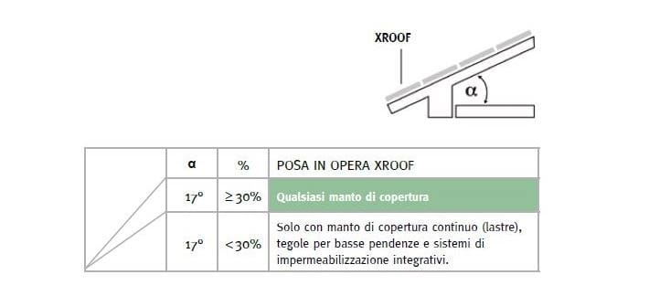 Xroof, per garantire le prestazioni di seconda impermeabilizzazione, deve essere applicato su coperture a falde, prestando attenzione alla pendenza delle stesse come sotto consigliato. In ogni caso attenersi alle indicazioni tecniche fornite dai produttori delle differenti tegole.