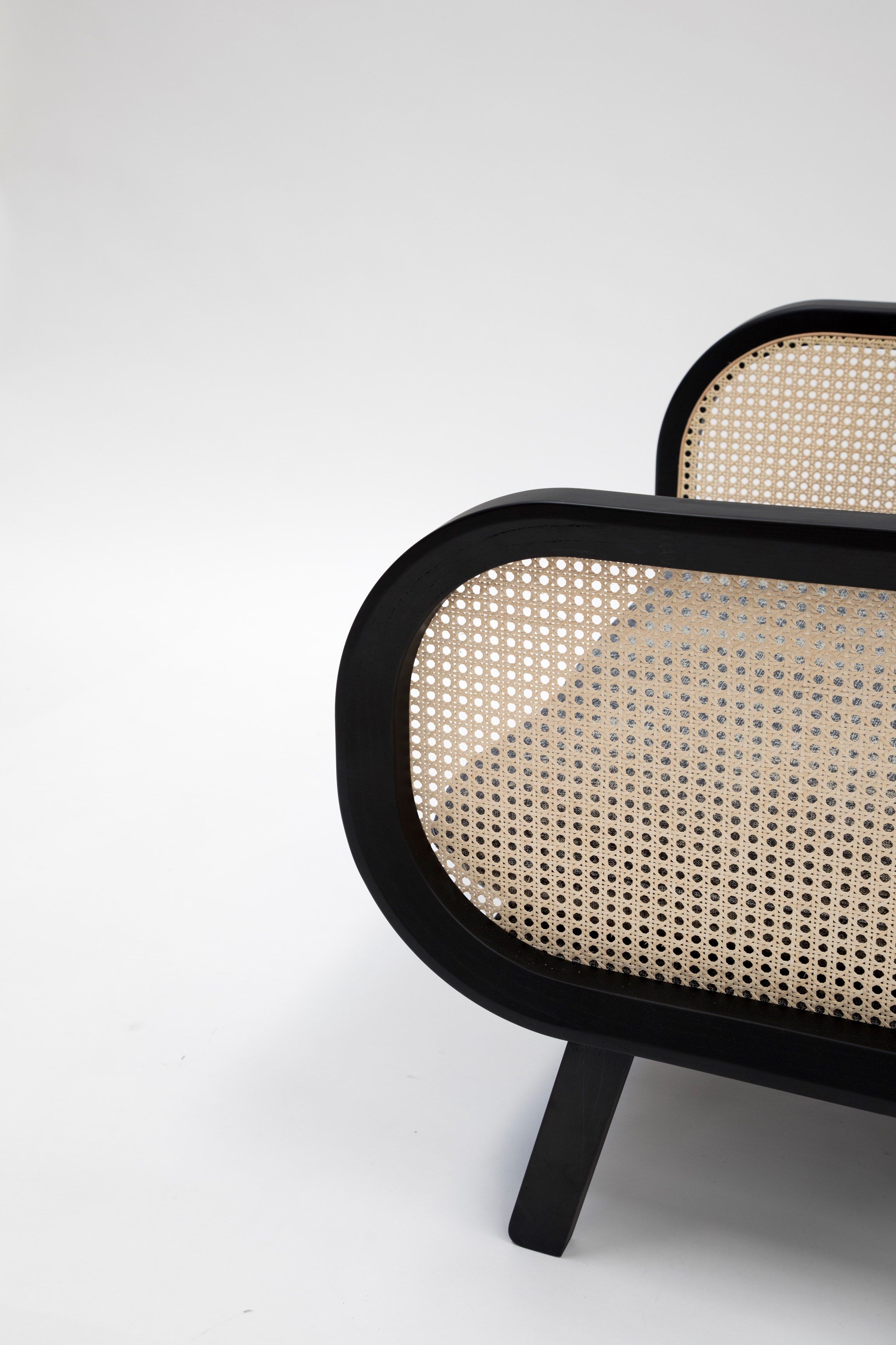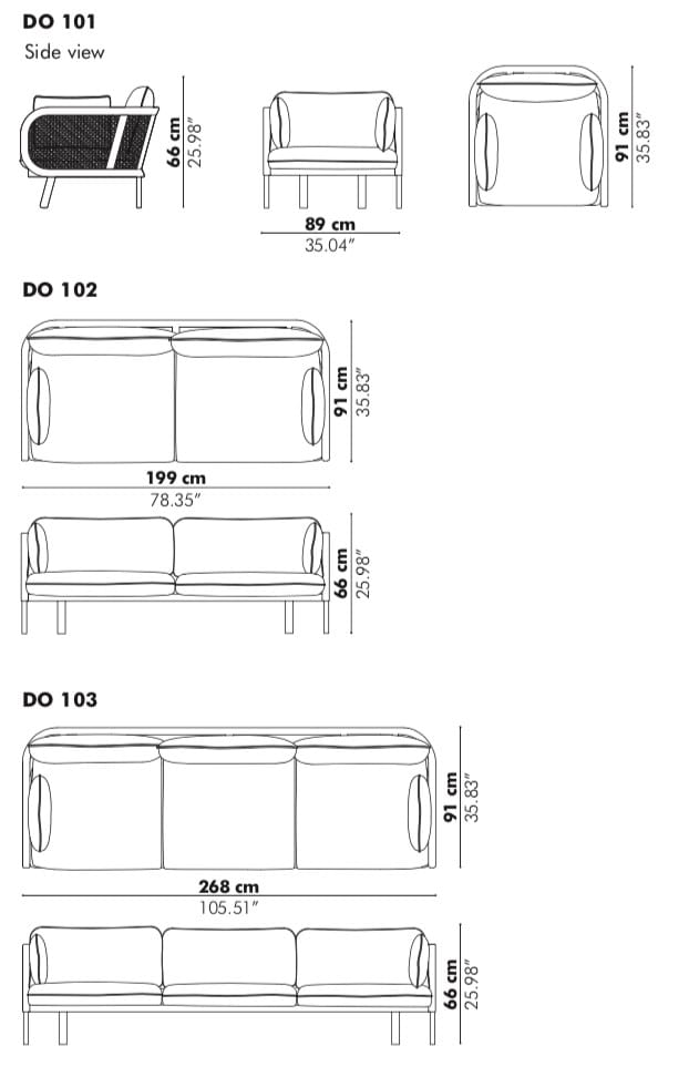 La struttura è in legno di frassino e i cuscini sono disponibili in tessuto e in velluto.