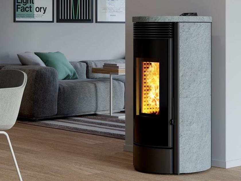 Stufa a pellet con rivestimento in steatite e struttura in acciaio verniciato.