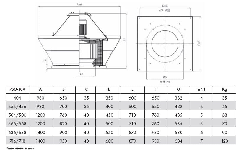 L’evacuatore forzato di fumo e calore PSO-TC è un torrino centrifugo per applicazione in copertura ed è composto da: collare di appoggio in cui è ricavato il boccaglio di aspirazione in lamiera di acciaio zincato, predisposto per il montaggio su basamento ed inserimento della serranda di sovrapressione; rete di protezione esterna antivolatile in filo di acciaio protetto contro gli agenti atmosferici; girante centrifuga a pale rovesce ad alto rendimento, realizzata in lamiera di acciaio zincato; motore elettrico asincrono trifase, grado di protezione IP 55, isolamento classe F, isolato dal flusso dell’aria convogliata e raffreddato dall’aria esterna, direttamente accoppiato alla girante. Tensione di alimentazione 400V – 50Hz; cappello di protezione realizzato in lamiera di acciaio zincato.