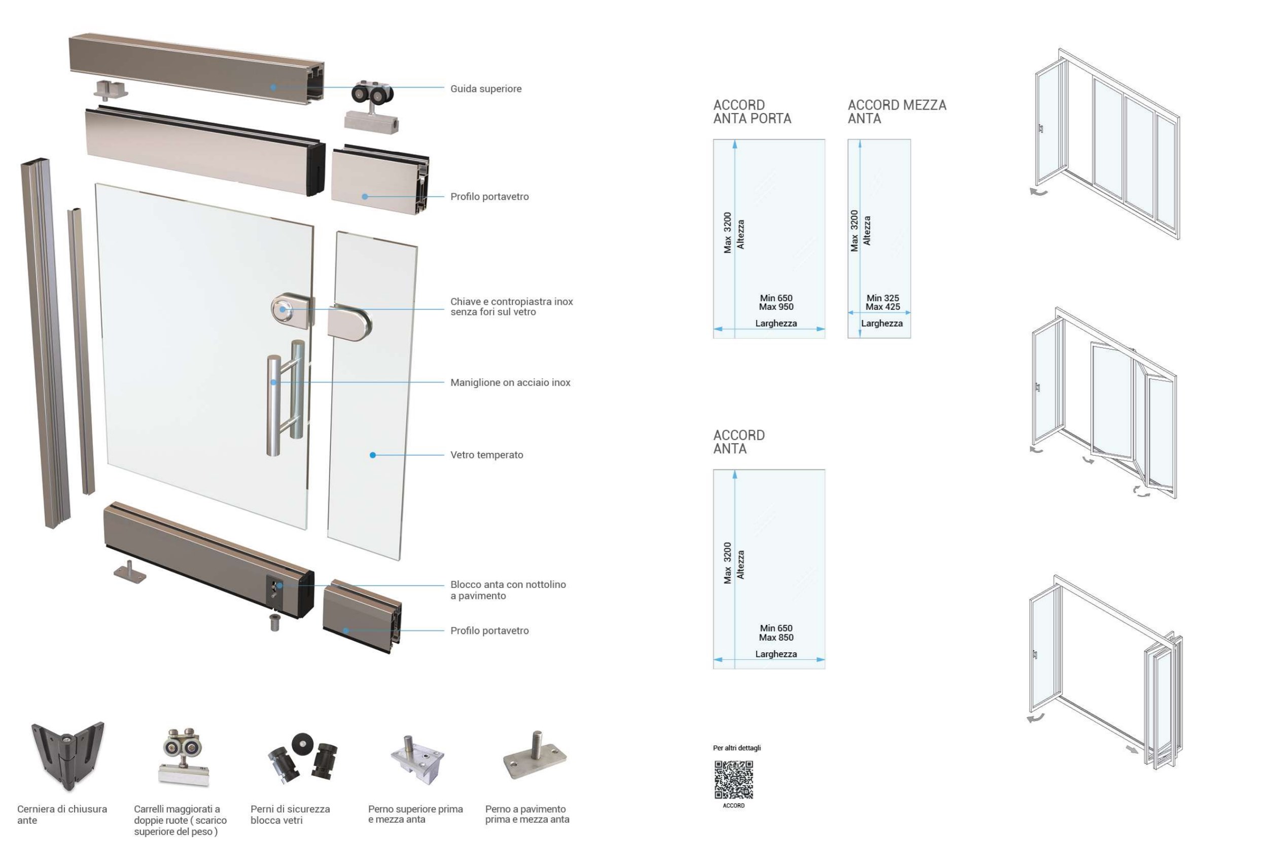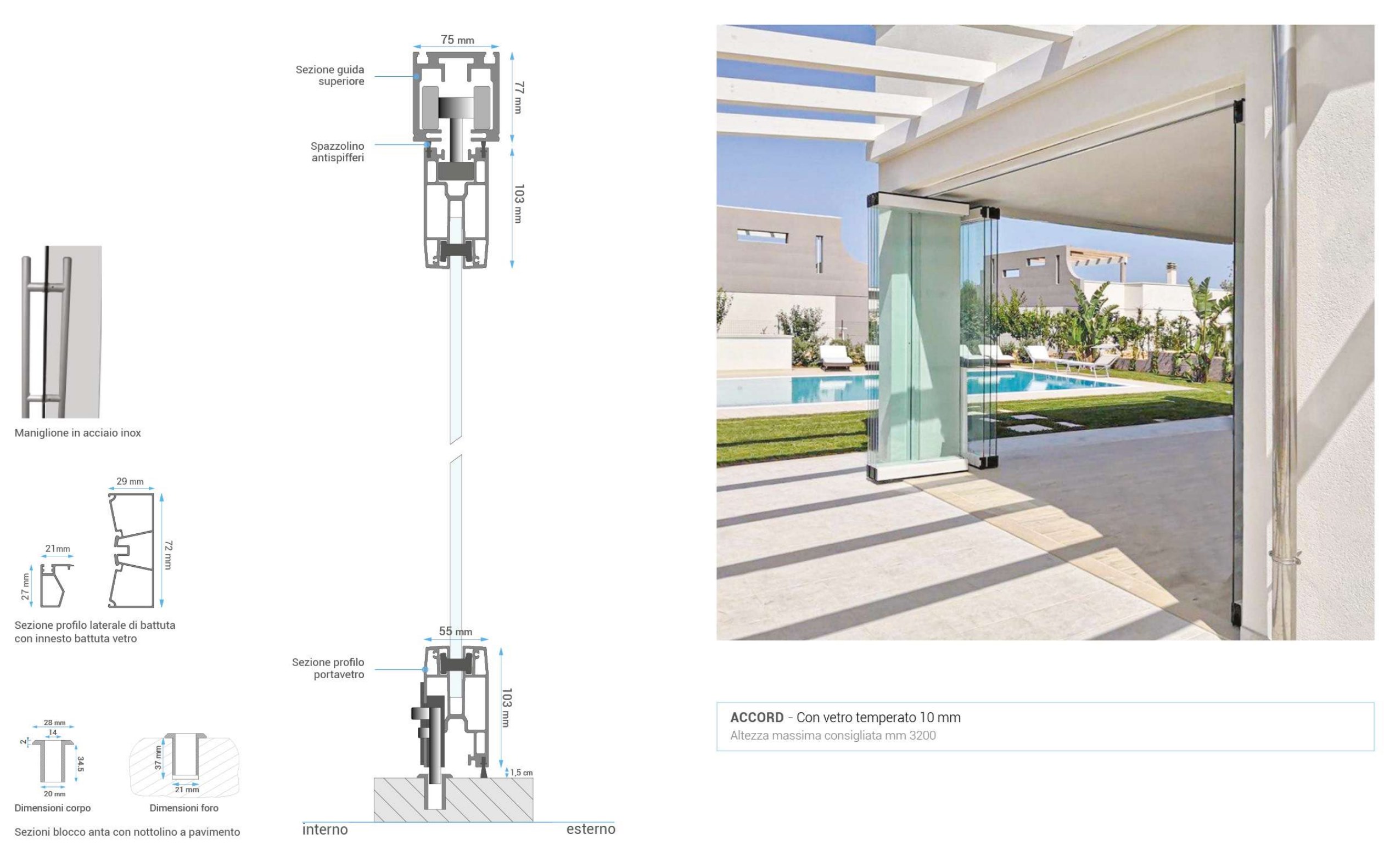 Accord è una vetrata scorrevole con apertura “a fisarmonica”, senza guide a pavimento. Duttile e pensata per un'ottimizzazione dei vani interni disponibili. Ideale per ristoranti, caffetterie, sale banchetti, negozi, uffici e in generale per pareti divisorie.