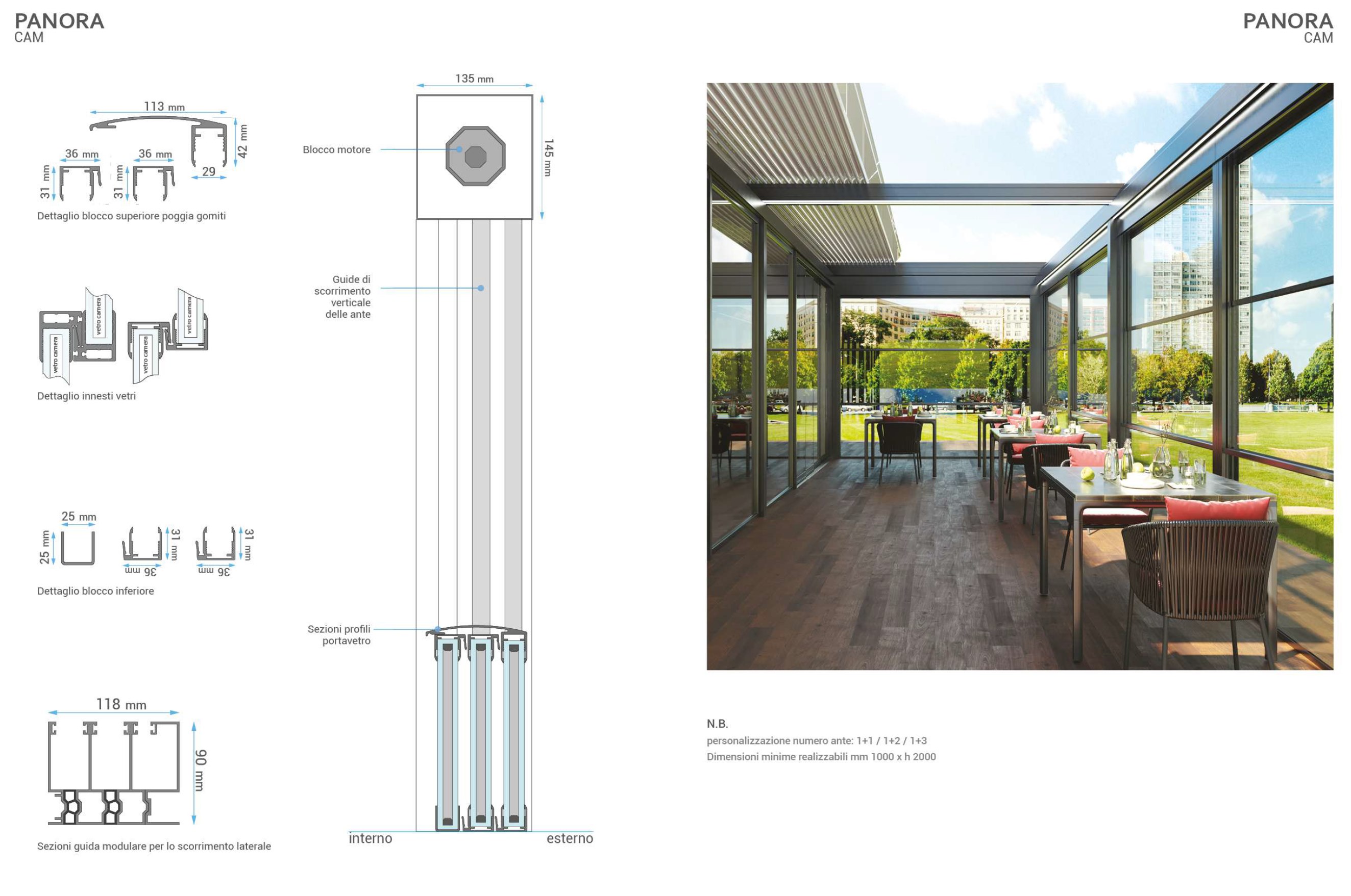 Panora CAM è una vetrata a scorrimento verticale, costituita da un sistema motorizzato con vetro-balaustra fisso e vetri alzanti superiori realizzati in vetro camera.
