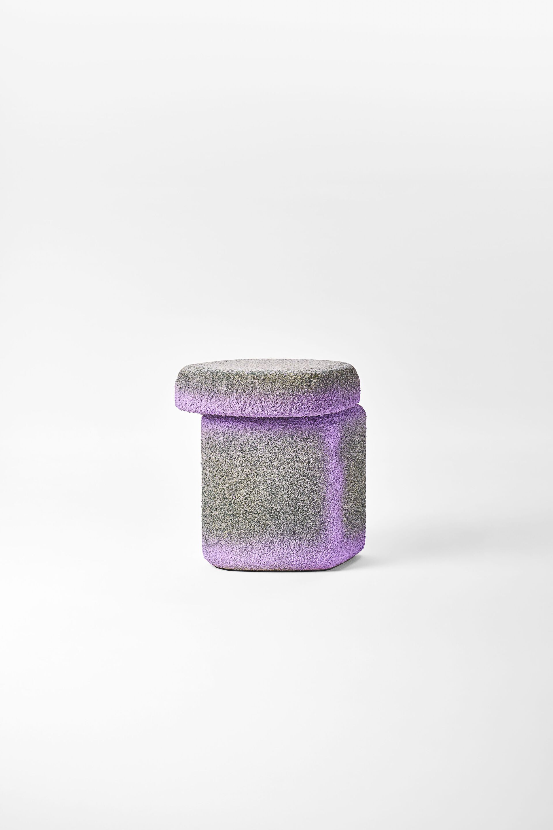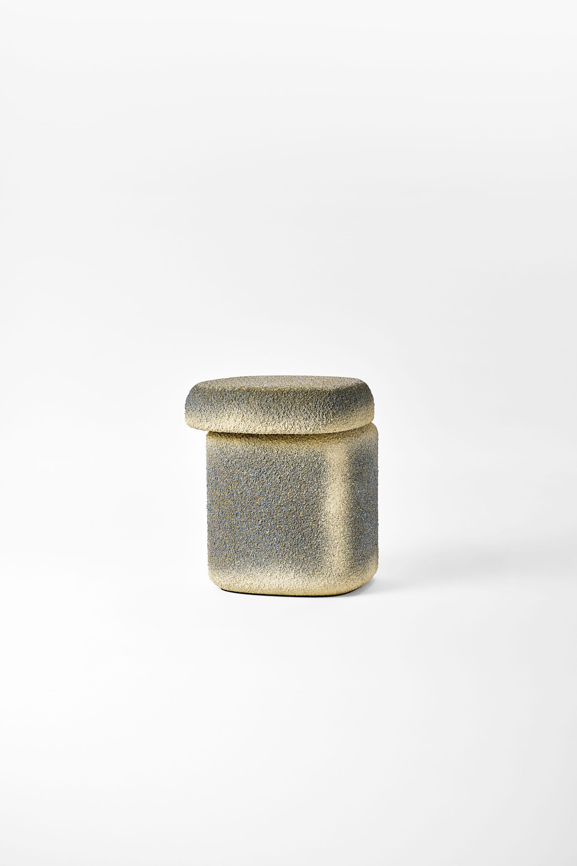 Sgabello dal design organico e minimalista. Due volumi che richiamano le conformazioni rocciose e la loro matericità, enfatizzata dal rivestimento in Cimento® stratificato dai colori cangianti.