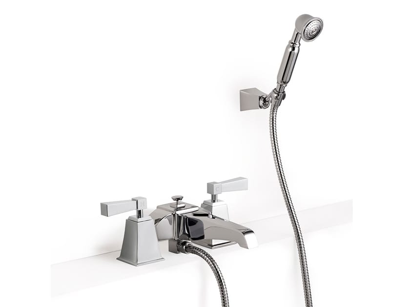 Vip Time - Design sofisticato e geometrie rigorose di chiara ispirazione Anni Trenta per un elegante gruppo vasca per montaggio bordovasca con doccetta, flessibile e sostegno snodato, reso inconfondibile dalle leve a tronco di piramide in ottone nero lucido, in cristallo bianco o in metallo. Disponibile in finitura cromo, nickel lucido e oro chiaro.