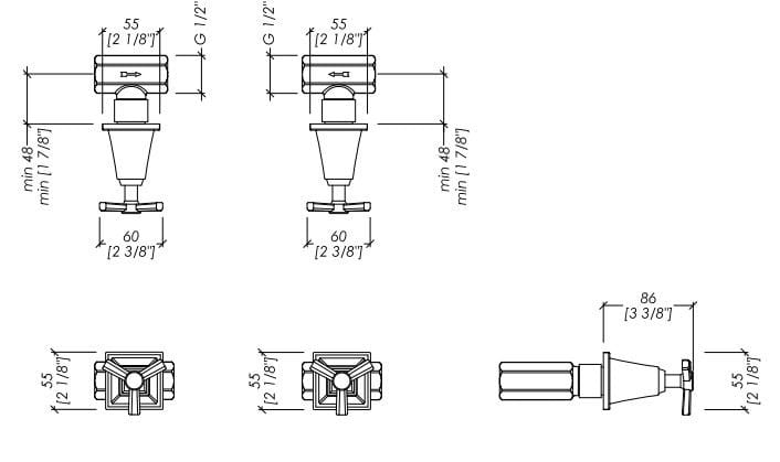 Gusto Anni Trenta per un una coppia di rubinetti d'arresto che rendono omaggio alla grande stagione dell'Art Déco americana, rileggendone in chiave contemporanea estetica e proporzioni. Sono di dichiarata ispirazione modernista la solidità monolitica, le linee geometriche e le superfici sfaccettate e riflettenti. Disponibile in finitura bronzo, cromo, nickel lucido, oro chiaro.