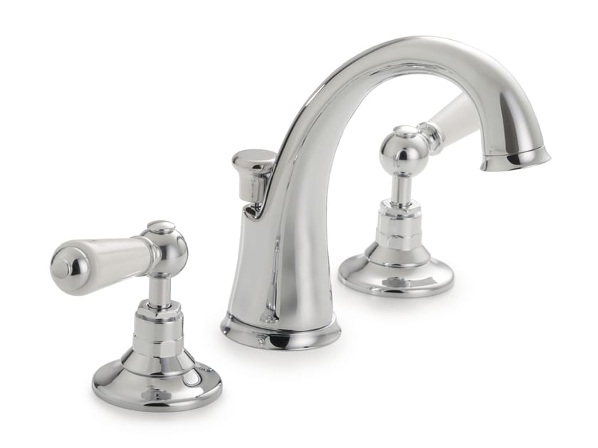 Dandy - Design sobrio e ricercato per un elegante batteria per lavabo a tre fori con saltarello e bocca di erogazione alta e leve in fine porcellana bianca. Realizzato in ottone, è disponibile in finitura cromo, nickel lucido, bronzo, oro chiaro.