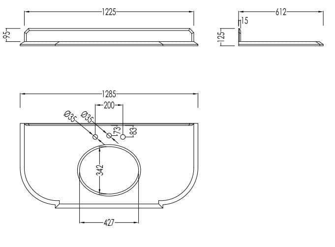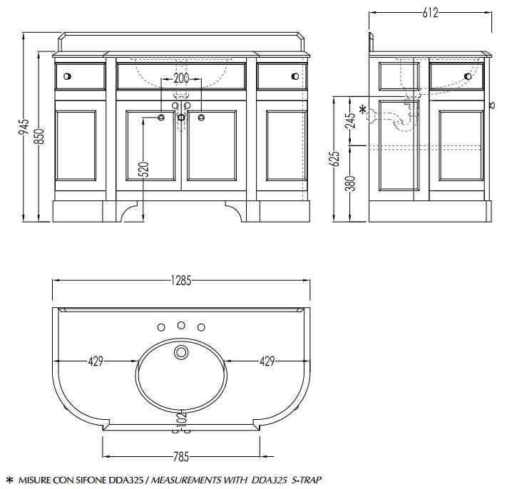 Sulla base, in legno laccato dark grey, off white o warm grey, si aprono due cassetti e due ampie ante curve impreziosite da cornici e pomelli in ottone. Il top e l'alzata sono in marmo bianco Carrara, nero Marquinha, Botticino fiorito o bianco Afyon.