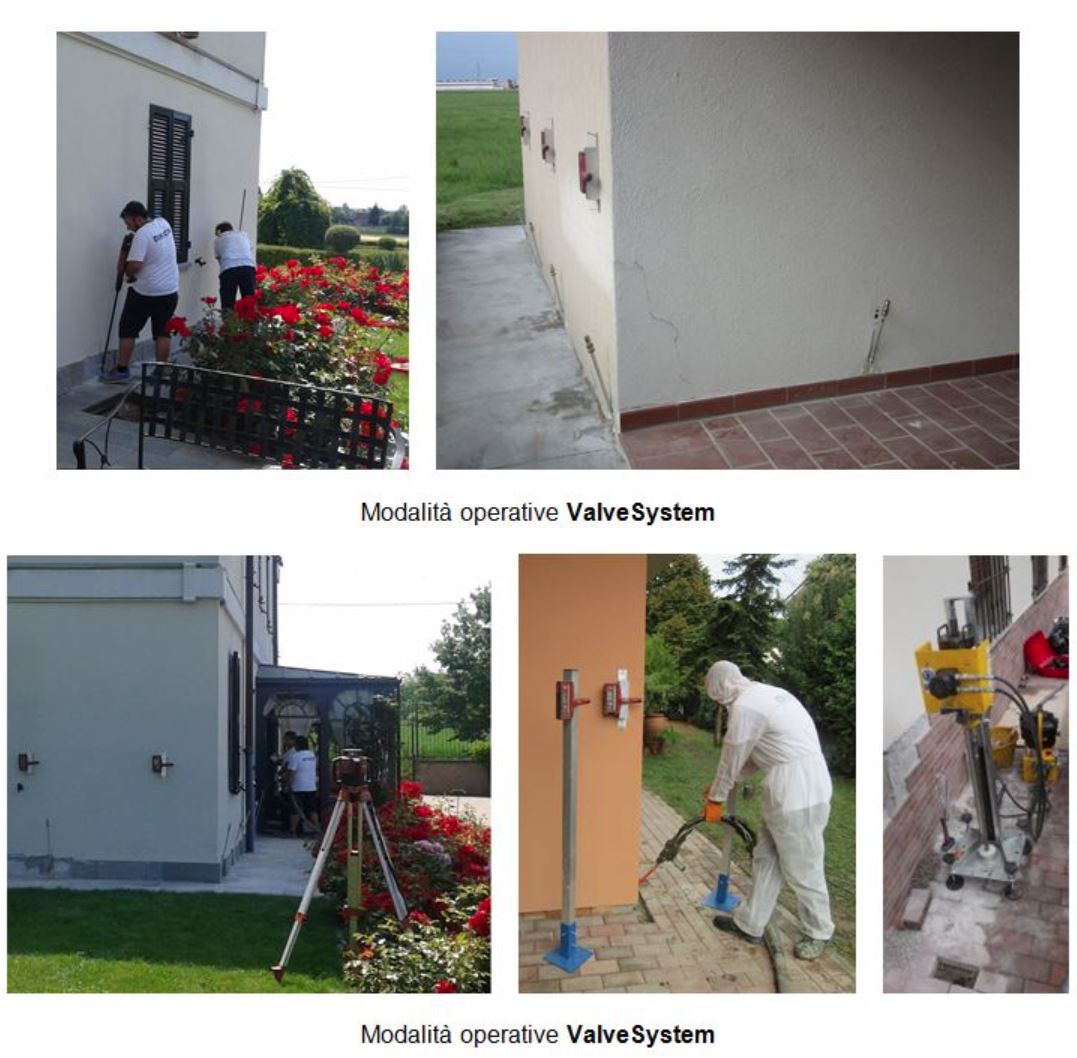 L’intervento ValveSystem richiede la realizzazione preliminare, in muratura e fondazione, di perforazioni sub-verticali passanti diametro 25 mm effettuate con trapani manuali ad interasse variabile tra 1 e 1,5 m in funzione della tipologia di fondazione e terreno.
