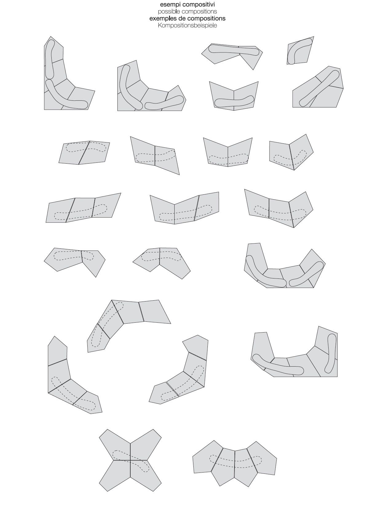 Ampio e completamente privo di strutture rigide con quattro sedute di forme diverse e due schienali, staccati dalla base e di differente misura, da collocare a piacere. Un sistema componibile che lascia libertà di espressione e massima personalizzazione: le sue strutture geometriche possono essere modulate in un’unica composizione o separate tra di loro, facendo cambiare prospettiva agli ambienti.