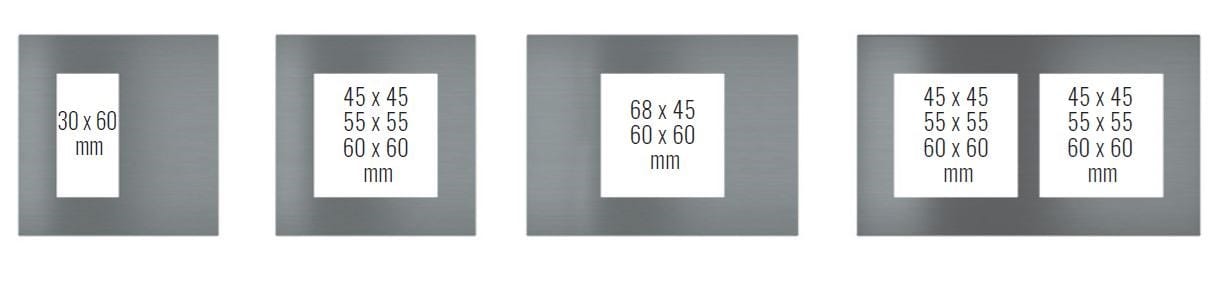 Doppia piastra: colore titanio, LED RGB. Dimensioni: mm 168 x 98 x 3 - Finestre: mm 60 x 60 (1) - mm 55 x 55 (1)