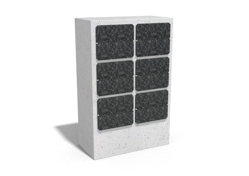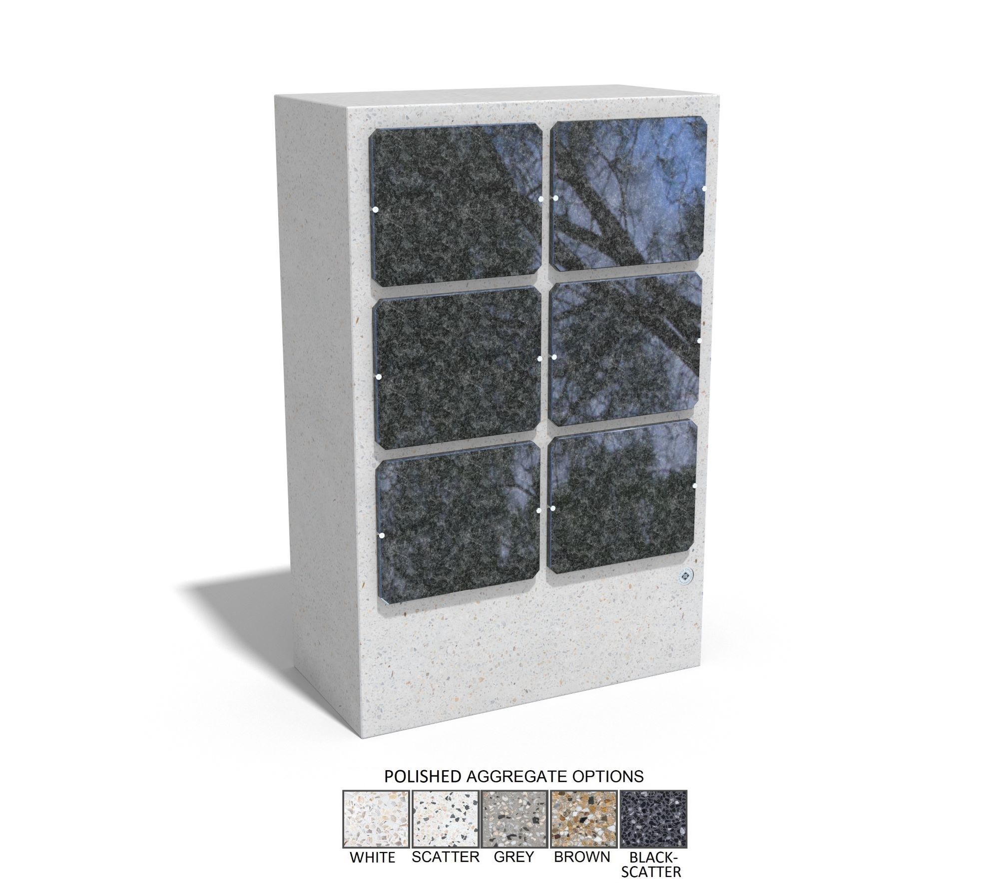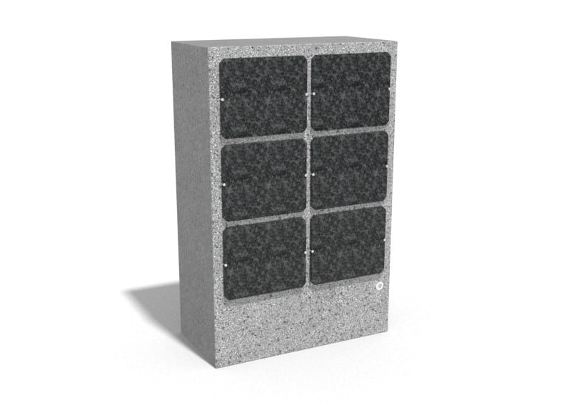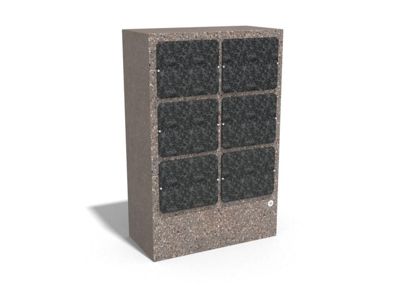 La parete commemorativa cod. 205 è realizzata in calcestruzzo fibrorinforzato di alta qualità e aggregato naturale in marmo naturale o pietre di granito in diversi colori. Le superfici sono trattate con uno speciale rivestimento che rende il prodotto ancora più resistente alle condizioni atmosferiche aggressive e riduce la deposizione di sporco. La parete è dotata di 6 nicchie ciascuna con pannelli di chiusura in granito nero. Per ogni nicchia c'è la possibilità di montare un vaso di fiori in acciaio inossidabile, disponibile come opzione aggiuntiva. Tutti gli elementi metallici sono realizzati in acciaio inossidabile. La parete commemorativa è una soluzione pratica per l'arredamento di cimiteri e crematori.