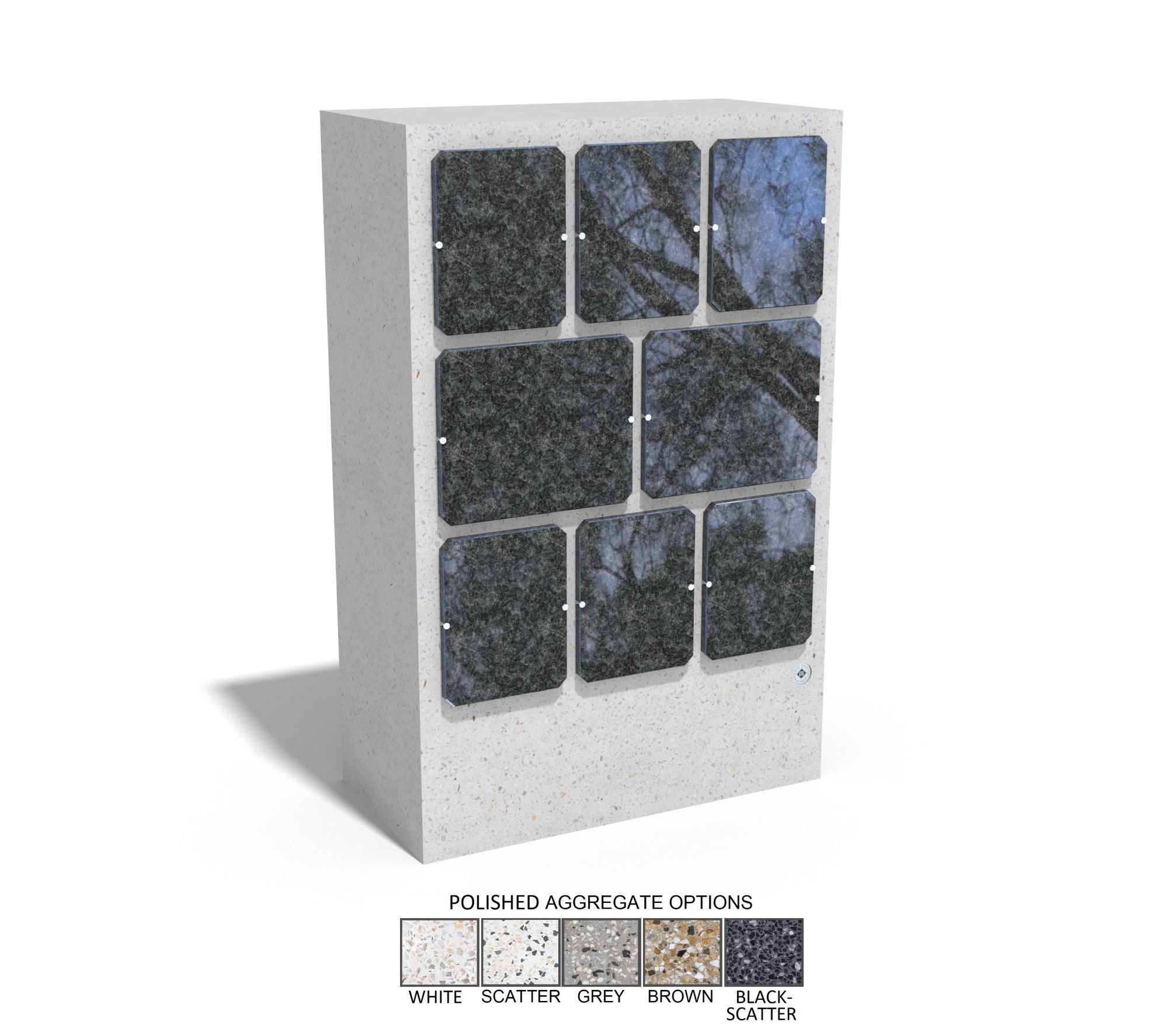 La parete commemorativa cod. 206 è realizzata in calcestruzzo fibrorinforzato ad alte prestazioni e aggregato naturale in marmo naturale o pietre di granito in diversi colori. Le superfici sono ulteriormente trattate con uno speciale rivestimento, ciò rende il prodotto ancora più resistente alle intemperie e riduce la deposizione di sporco. La parete è dotata di 8 nicchie, ciascuna con pannelli di chiusura in granito nero. Per ogni nicchia c'è la possibilità di montare un vaso di fiori in acciaio inossidabile, disponibili con opzione aggiuntiva. Tutti gli elementi metallici sono realizzati in acciaio inossidabile. La parete commemorativa è una soluzione pratica per l'arredamento di cimiteri e crematori.