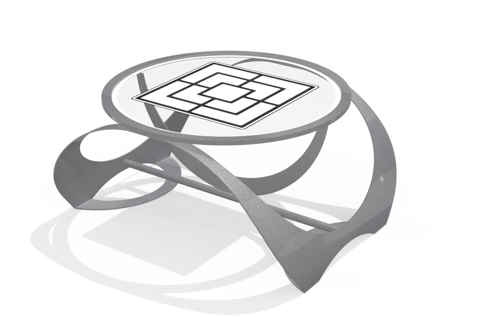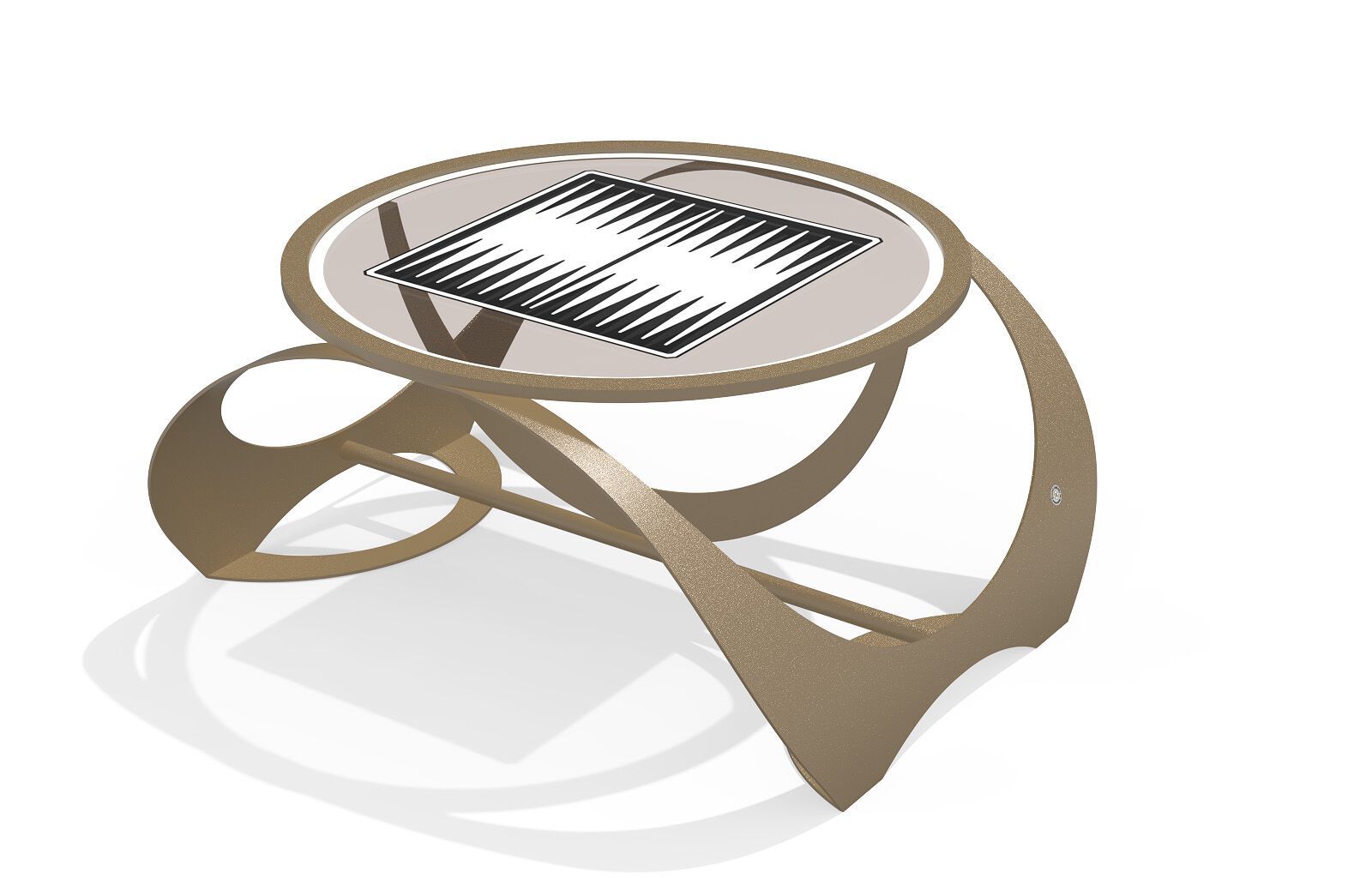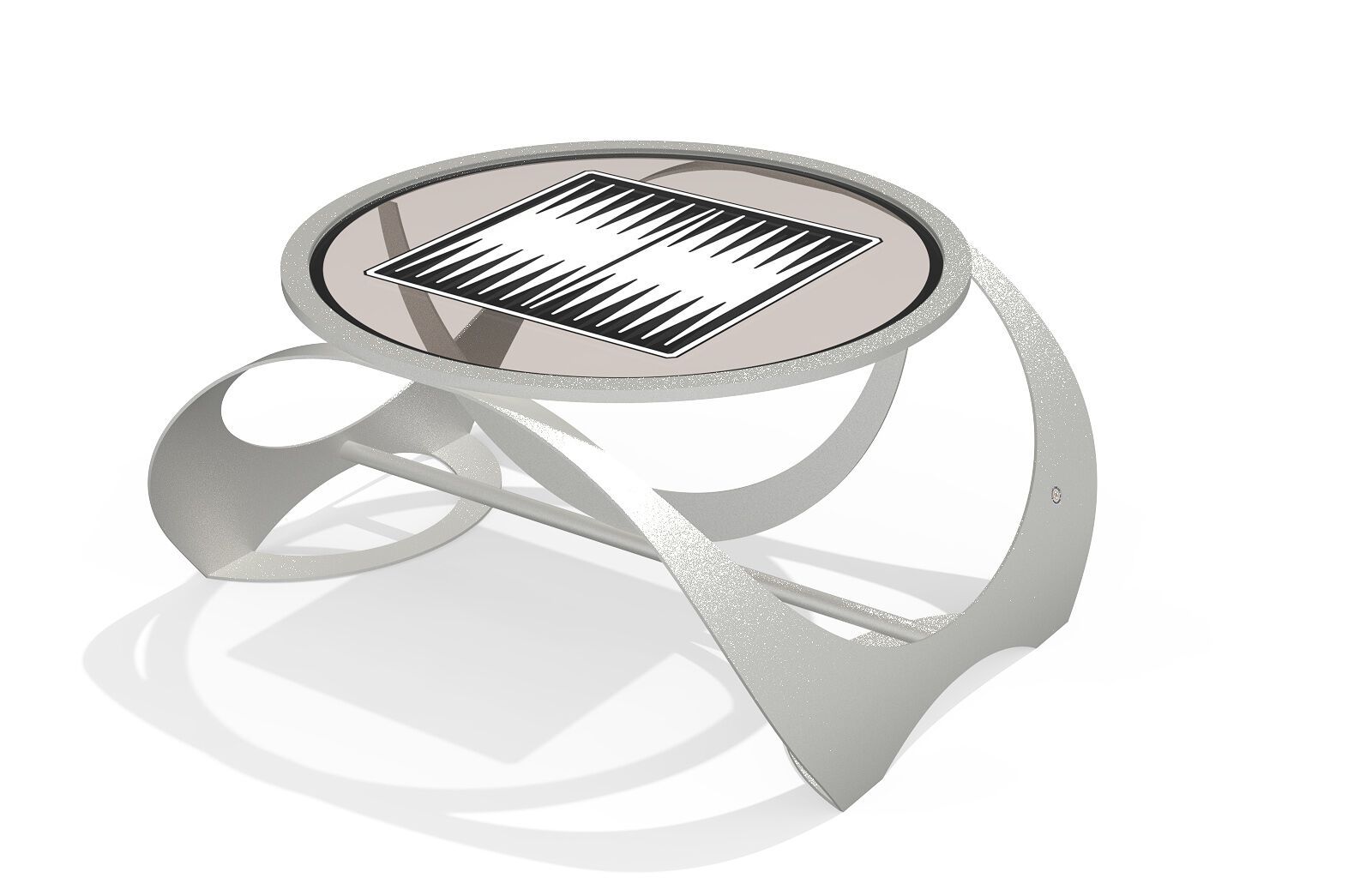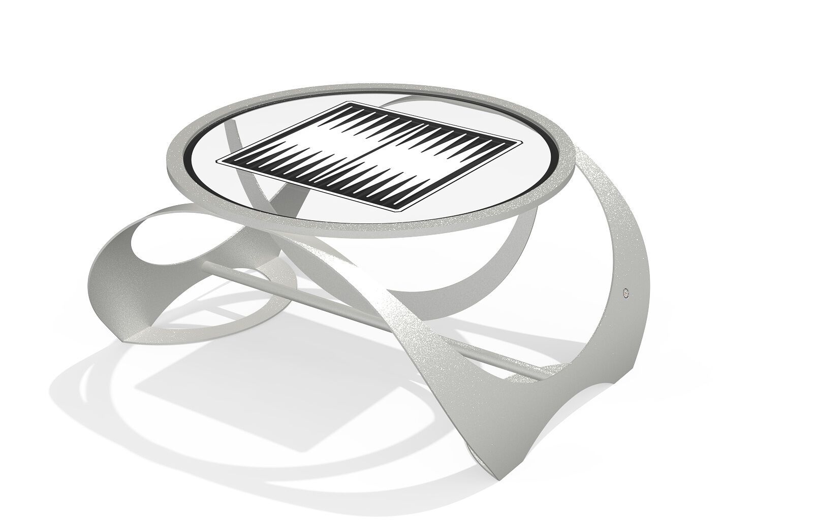 Il tavolo 385 riunisce le persone attorno al gioco con un'elegante silhouette rotonda ed elementi metallici in acciaio inossidabile con finitura a polvere di alta qualità. Il piano è in vetro temperato (molto resistente e sicuro), disponibile nelle varianti trasparente o colorata. Le tavole da gioco (scacchi, dama, backgammon, "Ludo") sono integrate tramite stampaggio preciso per un aspetto pulito e una facile manutenzione. I fori di ancoraggio alla base fissano il tavolo al pavimento per gli spazi pubblici.