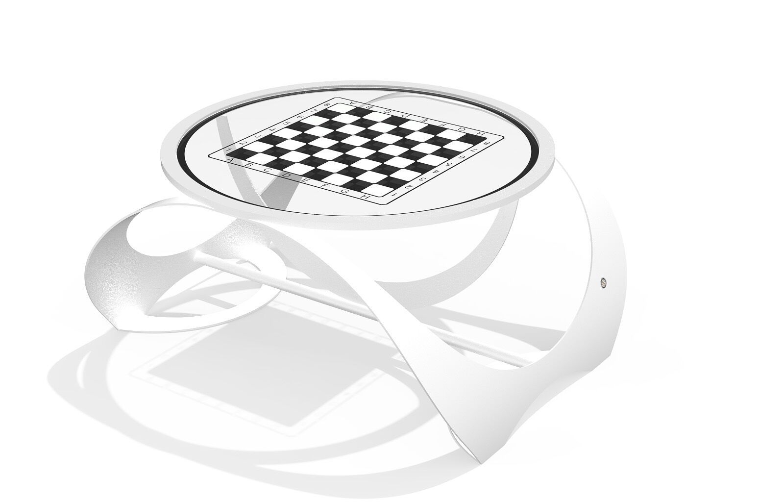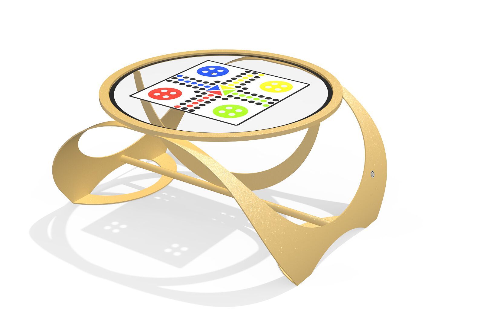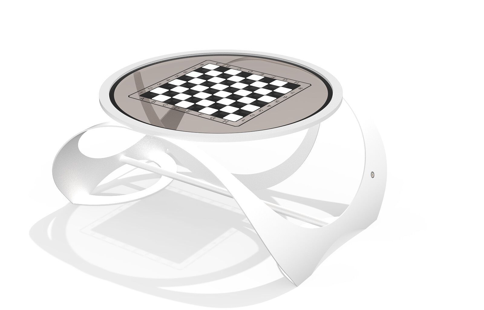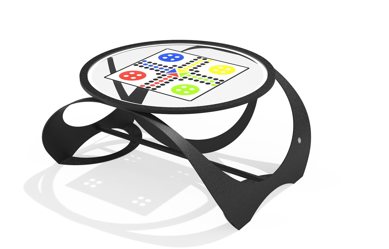 Il tavolo 385 riunisce le persone attorno al gioco con un'elegante silhouette rotonda ed elementi metallici in acciaio inossidabile con finitura a polvere di alta qualità. Il piano è in vetro temperato (molto resistente e sicuro), disponibile nelle varianti trasparente o colorata. Le tavole da gioco (scacchi, dama, backgammon, "Ludo") sono integrate tramite stampaggio preciso per un aspetto pulito e una facile manutenzione. I fori di ancoraggio alla base fissano il tavolo al pavimento per gli spazi pubblici.