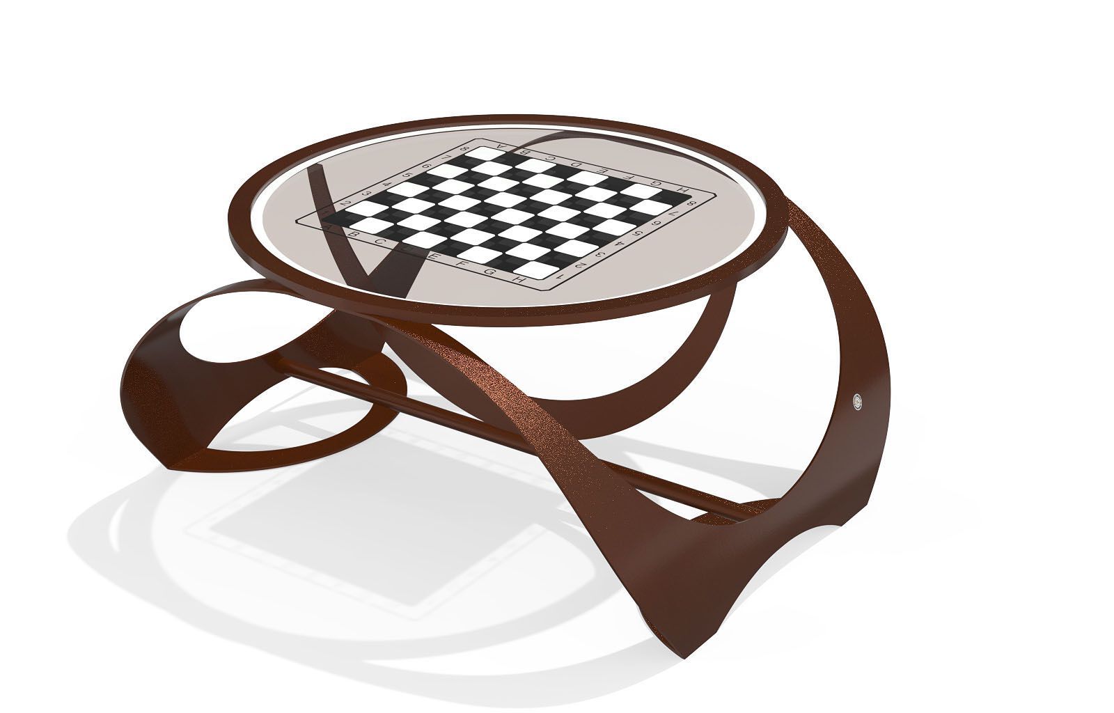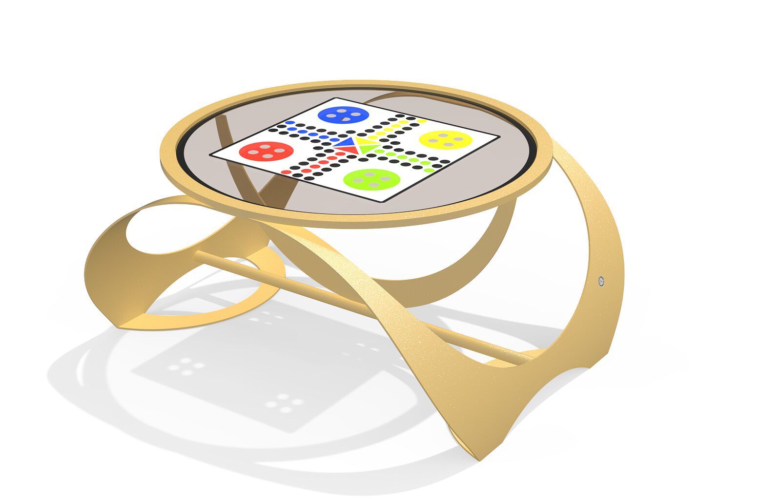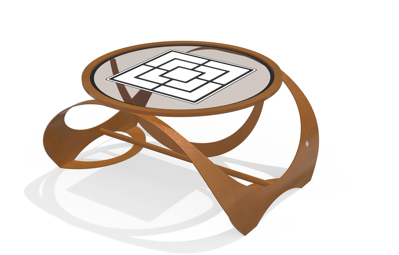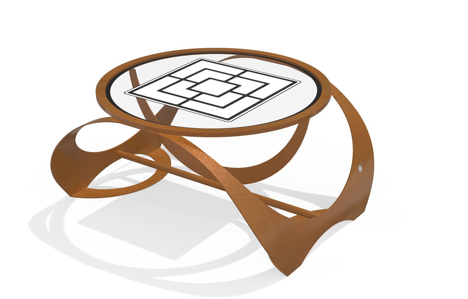 Il tavolo 385 riunisce le persone attorno al gioco con un'elegante silhouette rotonda ed elementi metallici in acciaio inossidabile con finitura a polvere di alta qualità. Il piano è in vetro temperato (molto resistente e sicuro), disponibile nelle varianti trasparente o colorata. Le tavole da gioco (scacchi, dama, backgammon, "Ludo") sono integrate tramite stampaggio preciso per un aspetto pulito e una facile manutenzione. I fori di ancoraggio alla base fissano il tavolo al pavimento per gli spazi pubblici.