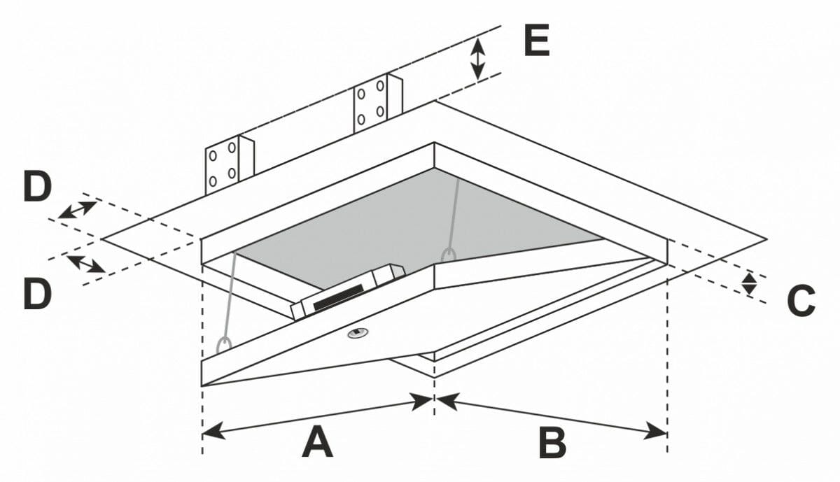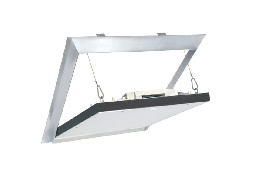 La botola F6 EI30 è composta da profili in alluminio, con lastra di gesso rivestito spessore 18 mm, 20 mm o 25 mm.