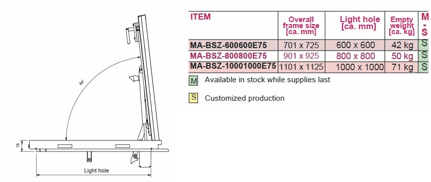 Il chiusino a pavimento Sistema MA-BSZ è realizzato in acciaio inox dello spessore di 2,5 mm. La profondità della vasca è 50 mm e l'altezza di installazione è di 75 mm. Il telaio è dotato di una speciale guarnizione a tenuta di gelo e agenti atmosferici, a protezione di infiltrazioni e fuoriuscita di odori. Il telaio viene fissato tramite gettata a livello del pavimento. Successivamente la vasca può essere riempita ed inserita nel telaio. L'apertura è sostenuta da due pistoni a gas di qualità che permettono l'apertura e la chiusura del chiusino da una sola persona. La sicurezza è garantita da un dispositivo di protezione anti caduta. Il riempimento della vasca è possibile con pavimentazione in pietra, piastrelle, cemento, resina, granito, legno e pavimenti duri o altri tipi di materiali. Con chiusura centralizzata, possibilità di apertura sia dall'esterno che dall'interno. La versione "ANTINCENDIO" è dotata di una piastra antincendio situata nella parte inferiore della vasca che garantisce la protezione al fuoco EI90.