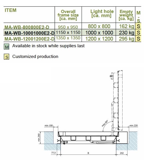 Il chiusino a pavimento Sistema MA-WB è realizzato in acciaio inox dello spessore di 5 mm. L'altezza di installazione è di 75 mm. Il telaio è dotato di una speciale guarnizione a tenuta di gelo e agenti atmosferici, a protezione di infiltrazioni e fuoriuscita di odori. Il telaio viene fissato tramite gettata a livello del pavimento. Successivamente la vasca può essere riempita ed inserita nel telaio. L'apertura è sostenuta da due pistoni a gas di qualità che permettono l'apertura e la chiusura del chiusino da una sola persona. La sicurezza è garantita da un dispositivo di protezione anti caduta. Il riempimento della vasca è possibile con pavimentazione in pietra, piastrelle, cemento, resina, granito, legno e pavimenti duri o altri tipi di materiali.