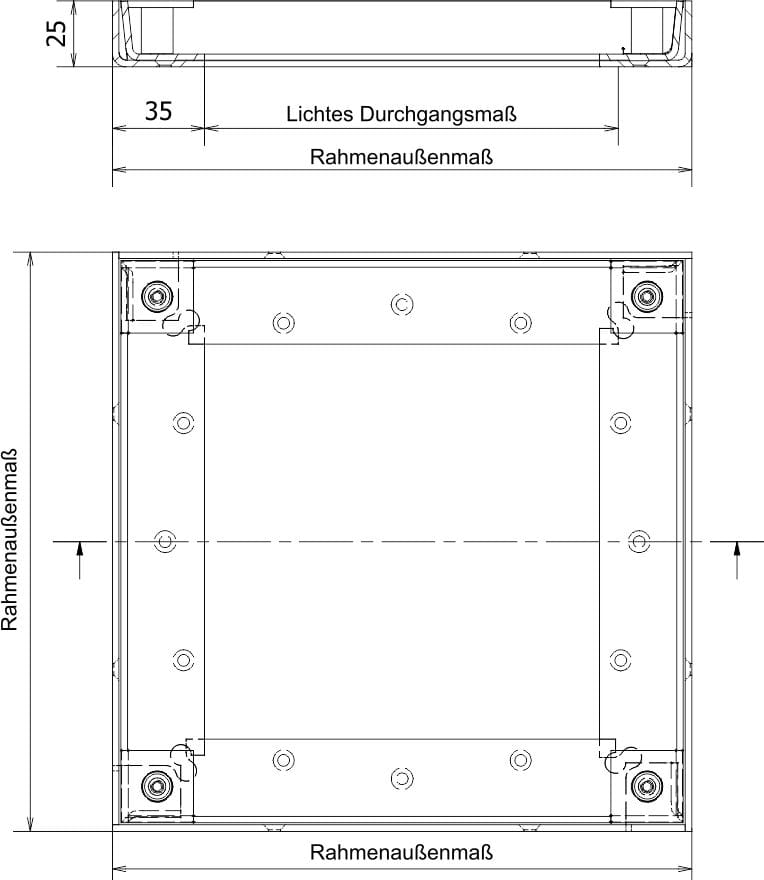 Il chiusino a pavimento Serie 2500 è realizzato con acciaio inox di 2,5 mm. La profondità della vasca è di 20 mm e l'altezza di installazione è di soli 25 mm. Il telaio viene fissato tramite gettata a livello del pavimento.