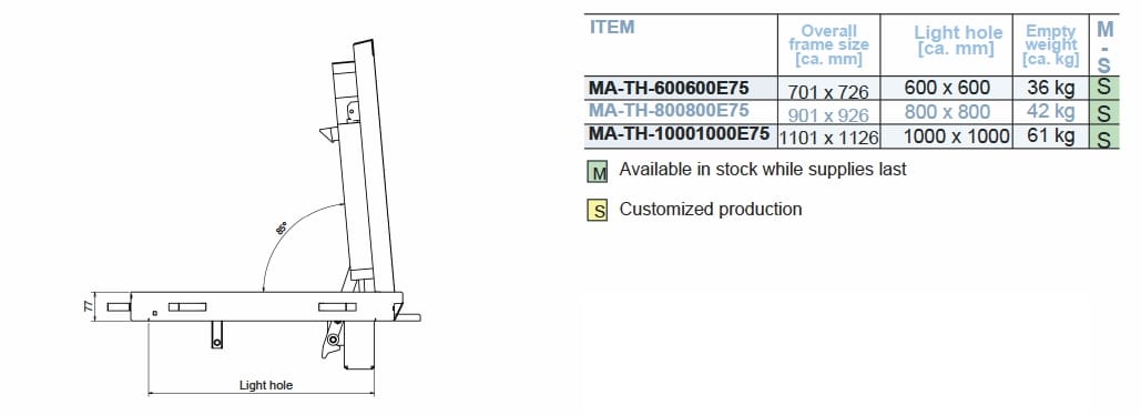Il chiusino a pavimento Serie MA-TH è realizzato in acciaio inox. La profondità della vasca è di 50 mm e l'altezza di installazione è di 77 mm. Il chiusino è dotato di una guarnizione speciali lungo tutto il perimetro a tenuta di gelo ed agenti atmosferici. Il telaio viene fissato tramite gettata a livello del pavimento. Successivamente la vasca può essere riempita ed inserita nel telaio e possono poi essere montati anche i due pistoni. L'apertura è sostenuta da due pistoni a gas che permettono cosi l'apertura a la chiusura da una sola persona. La sicurezza è garantita da un dispositivo anticaduta. Il riempimento della vasca è possibile con pavimentazione in pietra, piastrelle, cemento, resina, granito, legno e pavimenti duri o altri materiali.