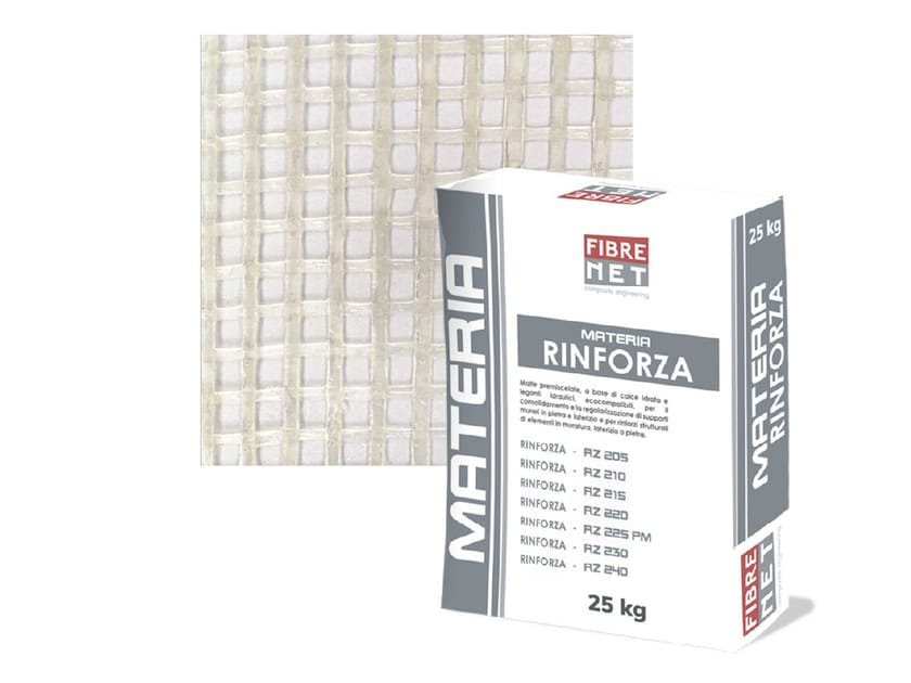 Componenti del sistema C-MATRIX G220C25-H: Rete impregnata in fibra di vetro AR 200 g/m2 + Malta strutturale a base calce idrata e leganti idraulici, resistenza alla compressione ≥ 25 MPa.