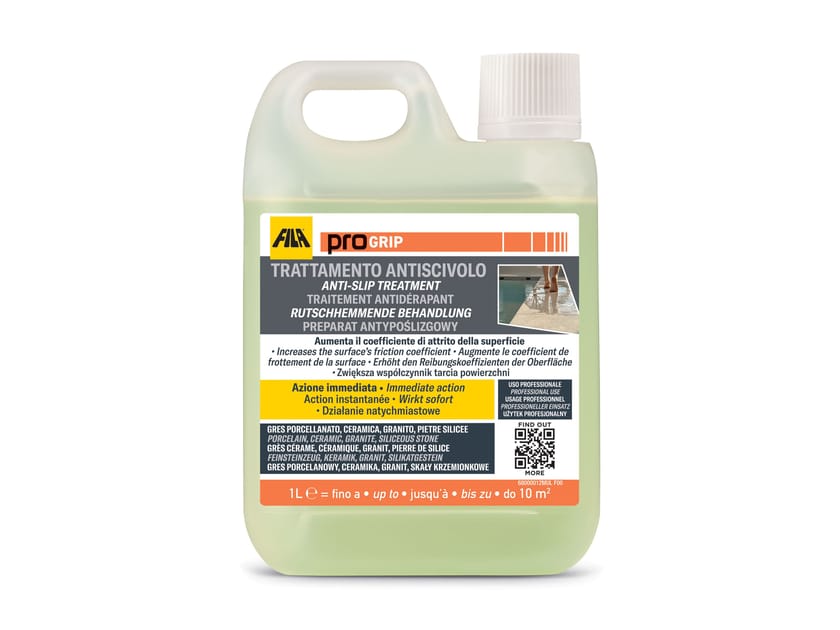 PROGRIP è un trattamento antiscivolo specificatamente formulato per un’applicazione professionale su materiali come gres porcellanato, ceramica, granito e pietre silicee. Ideale per ambienti interni come zone piscine, spa, rampe e pavimenti dove vi sia ristagno d’acqua o condensa. Il trattamento può essere eseguito su superfici esterne dove si evidenziano situazioni di scivolosità a causa della pioggia, dell’umidità o negli ingressi di locali pubblici. E’ utile anche per intervenire su errori progettuali dove è stato installato un materiale con un coefficiente di attrito non adeguato all’ambientazione d’uso.