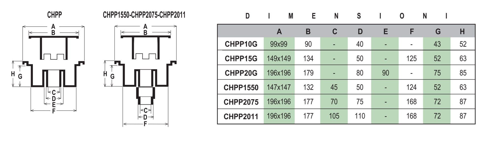 Il chiusino sifonato CHPP1550G ha le seguenti dimensioni 150x150 mm - h. 63 mm e viene prodotto in PP colore grigio. Il chiusino è completo di bocchello in PVC per scarico verticale ø 50 mm.