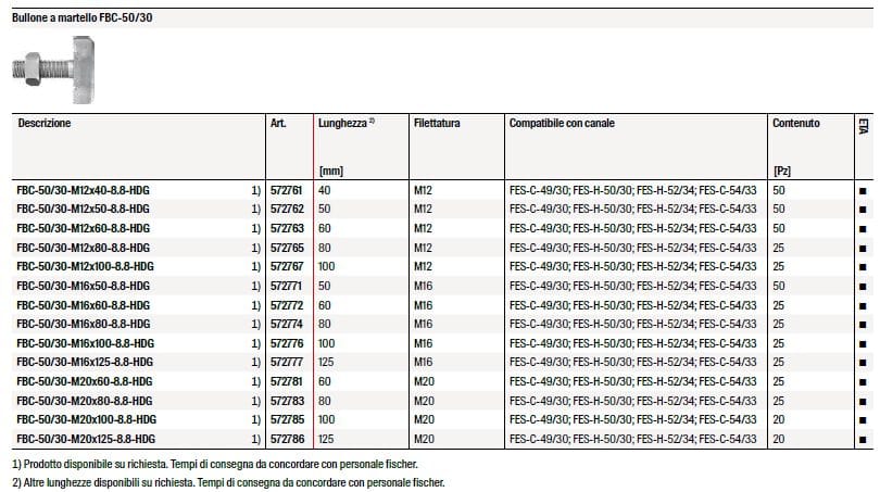 - Bullone a martello FBC liscio compatibile con binari Cast-in con bordi lisci.