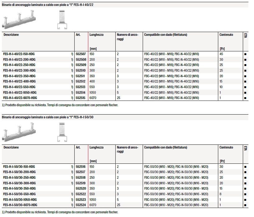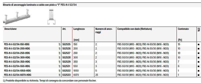 Il binario di ancoraggio FES-H-I è una versione speciale del collaudato binario di ancoraggio FES-H, che si differenzia per la forma a "I" del piolo di ancoraggio, saldato direttamente al canale. Questi binari di ancoraggio laminati a caldo grazie al bordo a spessore maggiorato offrono alta capacità di carico e grande sicurezza. ll bordo liscio permette di scegliere tra bulloni a martello lisci FBC in assenza di sforzi longitudinali oppure utlizzare i bulloni con bugne FBC-N se è necessario offrire resistenza anche a sforzi paralleli all'asse longitudinale del binario. Questa soluzione di fissaggio preposizionata aiuta a compensare le tolleranze in loco ed è adatta per applicazioni sia in calcestruzzo fessurato che non fessurato. Inoltre, i binari di ancoraggio fischer offrono una soluzione di fissaggio regolabile in modo permanente che soddisfa le esigenze tecniche dei più complessi progetti di costruzione. Con i binari di ancoraggio FES-H-I di fischer, progettisti ed installatori beneficiano di sistemi che soddisfano alti standard di prestazione, durabilità e sicurezza.