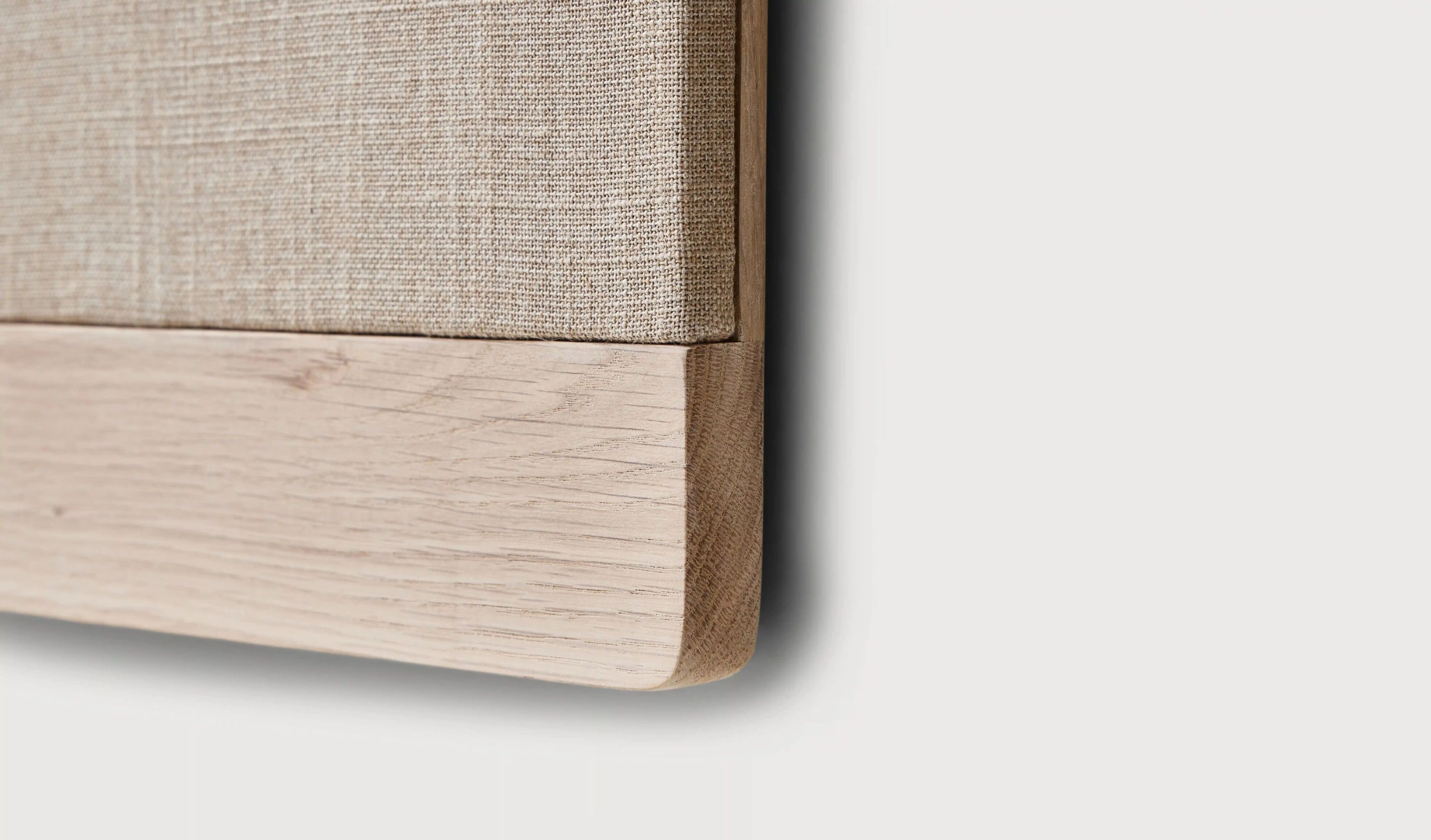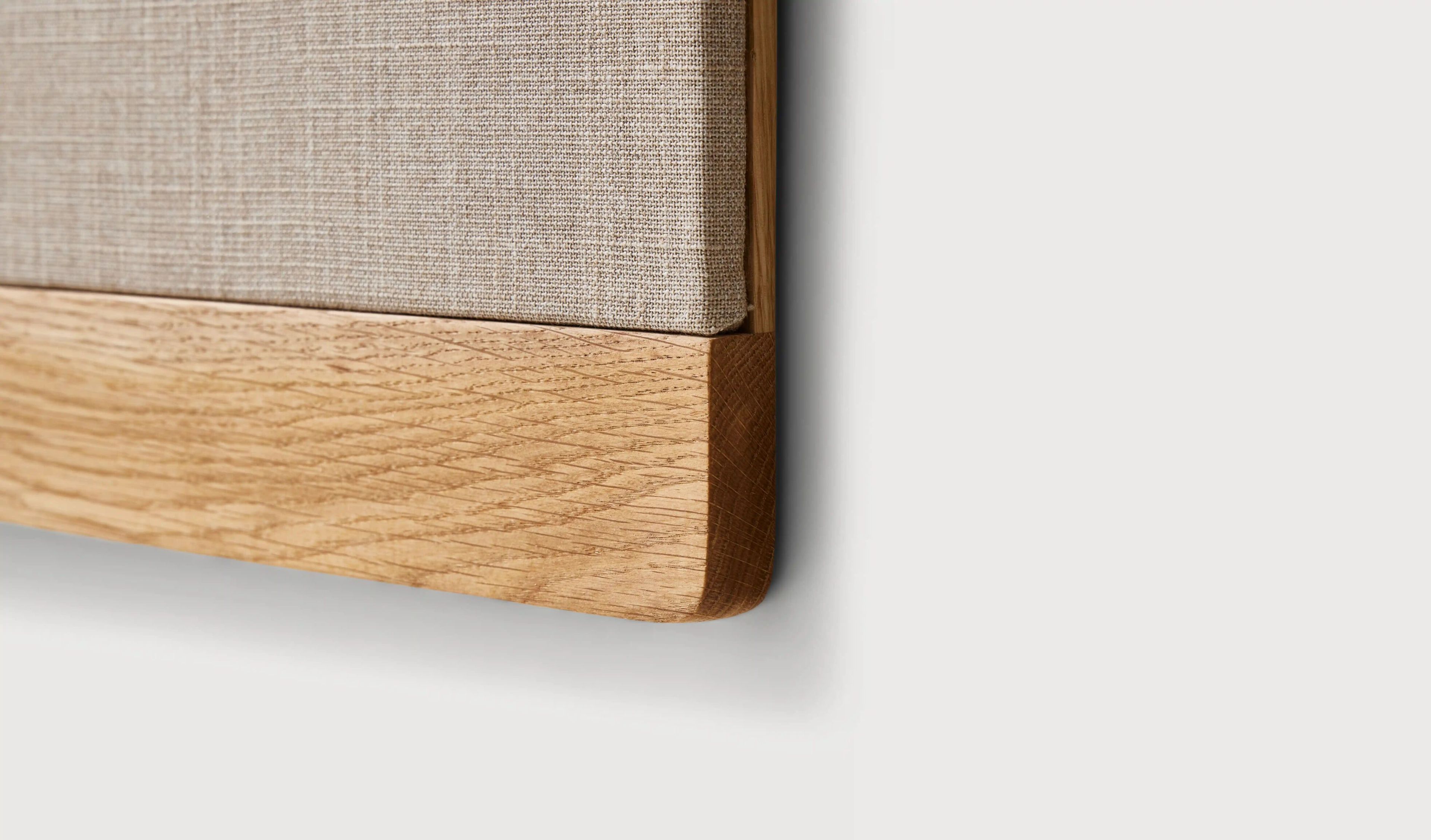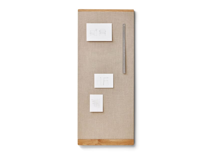 “Volevamo creare una bacheca dal look caldo e morbido, in cui il tessuto si armonizzasse con il calore del rovere. Il telaio della bacheca ha un ampio raggio sul retro, che la solleva dalla parete creando un’ombra delicata.” – Jonas Herman – Herman Studio
