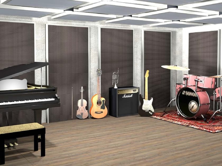ALFACUSTIK ONDA MUSIC è un elemento fonoassorbente e fonoisolante per parete e soffitto per studio musicale, costituito da un pannello in fibra di poliestere conformato ad onde della densità di 80 Kg m³. Riciclabile al 100%.