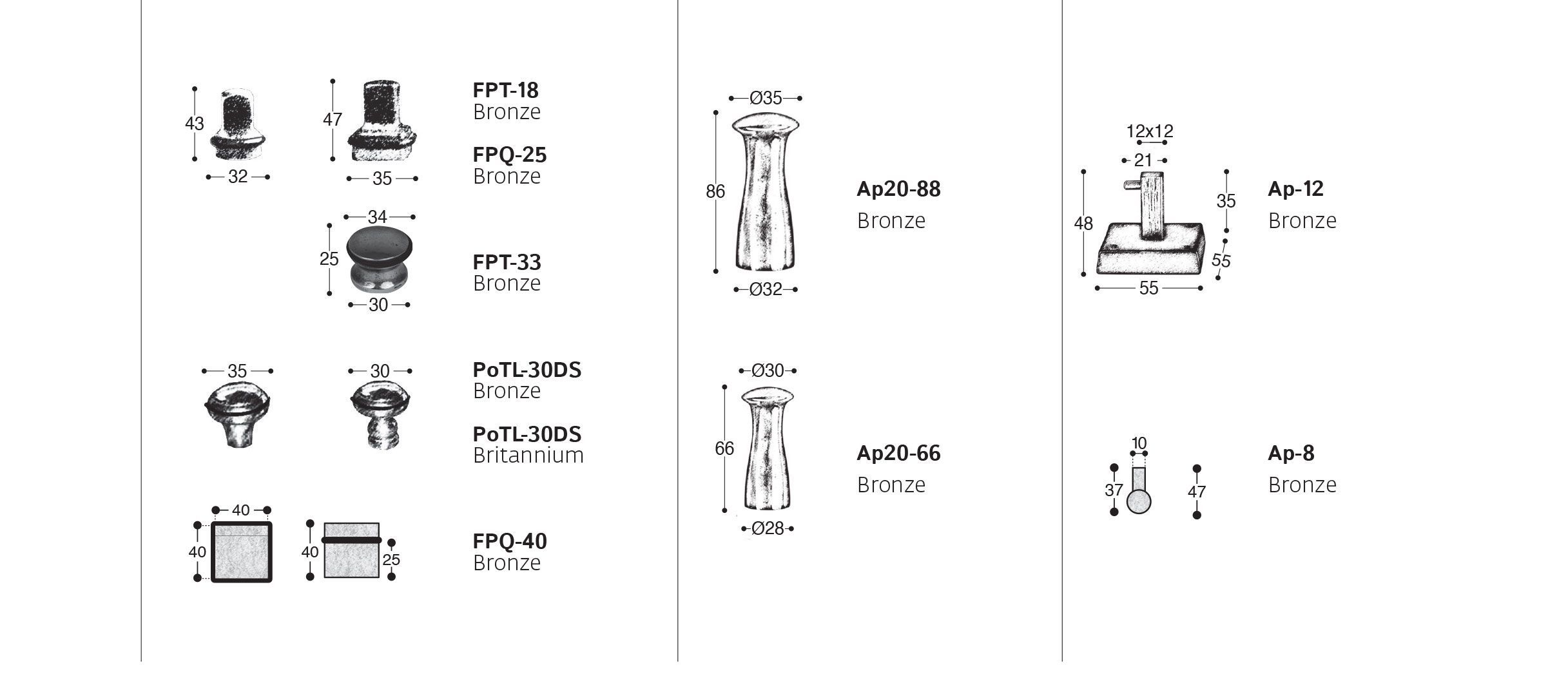Finiture: Bronzo Naturale / Bronzo Antico / Verde Imperiale / Bronzo Bianco / Argento Antico / Ferro Antico / Bronzo Naturale Ossidato / Peltro Antico / Bronzo Nero / Britannio / Bronzo Grezzo / Bronzo Bianco Grezzo