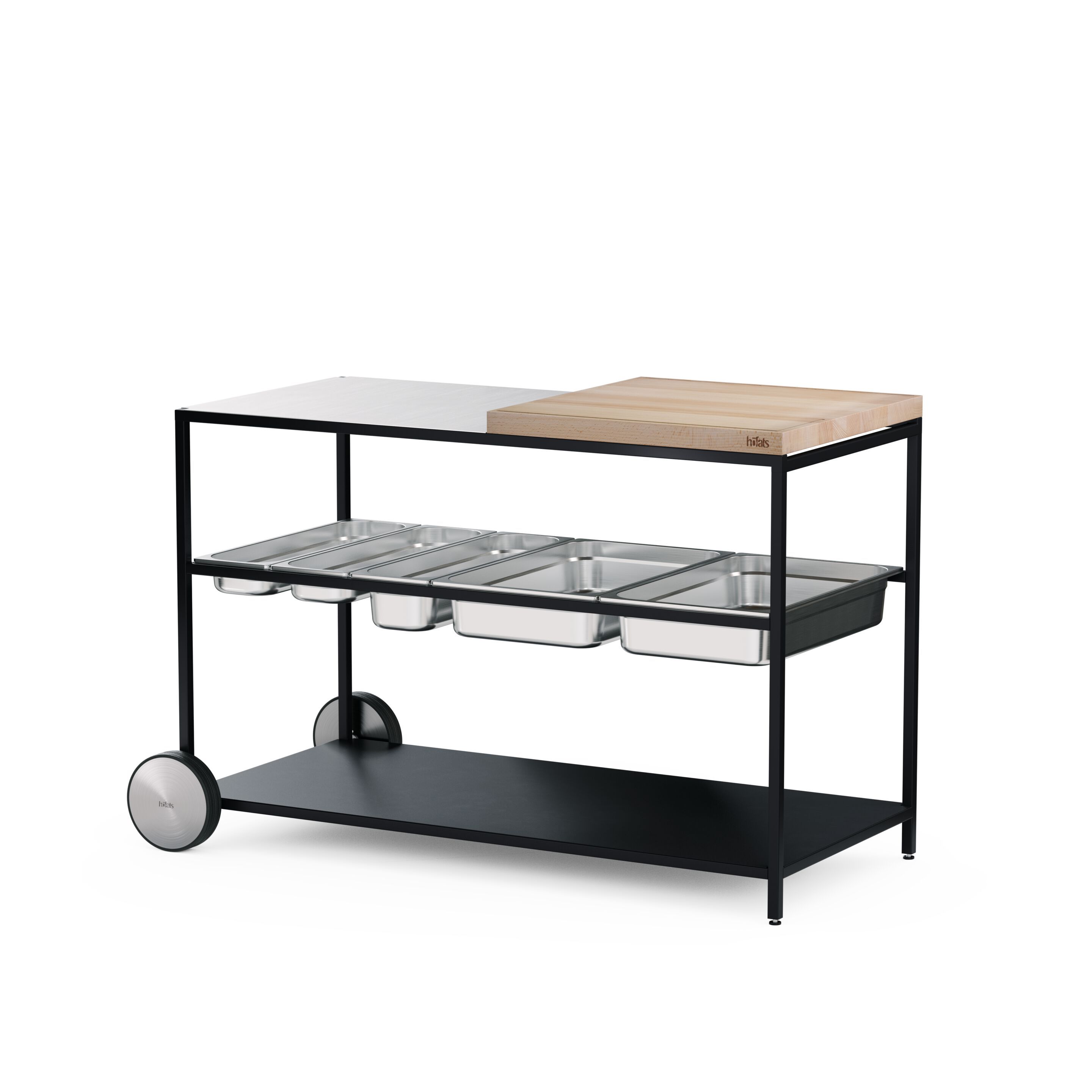 Con FIRE KITCHEN si può grigliare all'aperto sulla BOWL, con tutti gli ingredienti e gli strumenti in un unico posto. FIRE KITCHEN posiziona il barbecue alla perfetta altezza di lavoro, mentre l'adiacente piano di lavoro con scanalatura per gli ingredienti offre lo spazio per preparare il cibo accanto alle fiamme. I ripiani modulari e i contenitori in acciaio inossidabile offrono spazio extra per strumenti e ingredienti e le grandi ruote consentono di spostare FIRE KITCHEN nei punti preferiti.