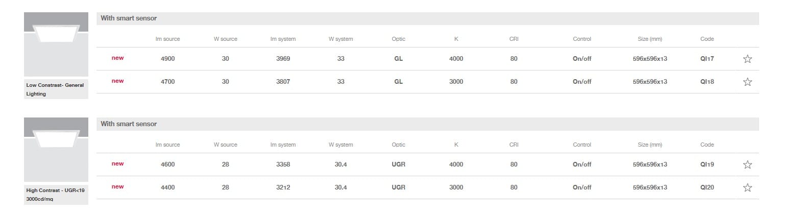 Vano ottico in lamiera d’acciaio verniciato, schermo diffusore in metacrilato per emissione luce generale o microprismato per emissione con luminanza controllata UGR<19 3000 cd/m2.