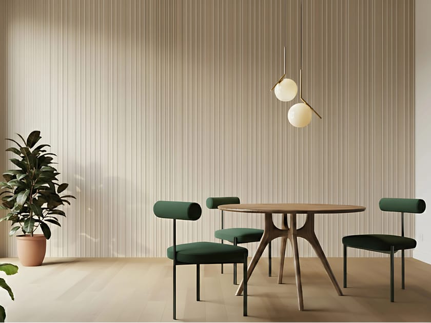 La collezione Marea trae ispirazione dalla purezza del cerchio, da cui nascono linee verticali dalla larghezza irregolare. Porzioni di circonferenza che creano un ritmo armonico e mai statico. La superficie si anima così di un delicato movimento, con un raffinato effetto di boiserie rigata, reso unico dal profilo leggermente bombato che aggiunge morbidezza e profondità visiva.