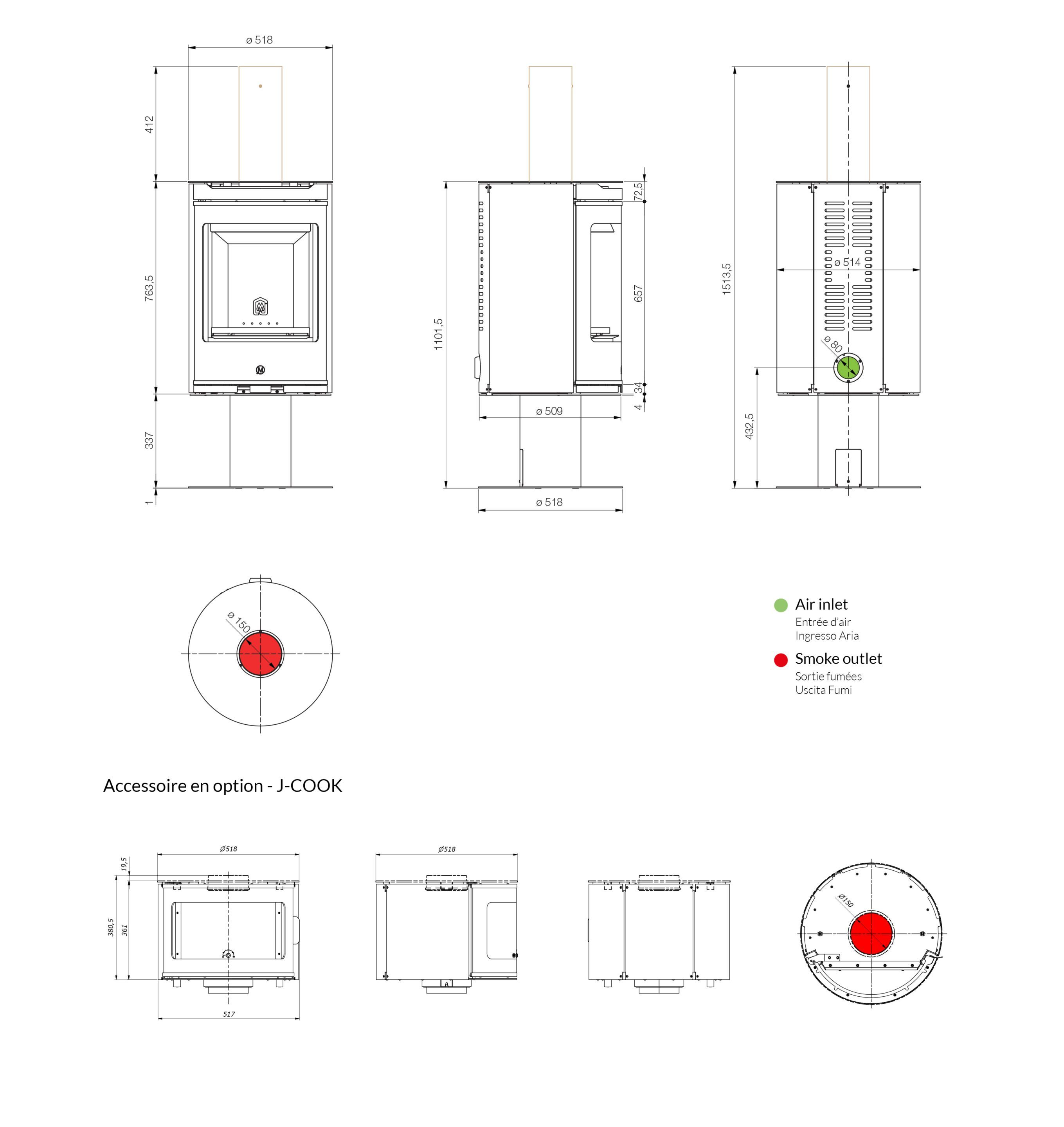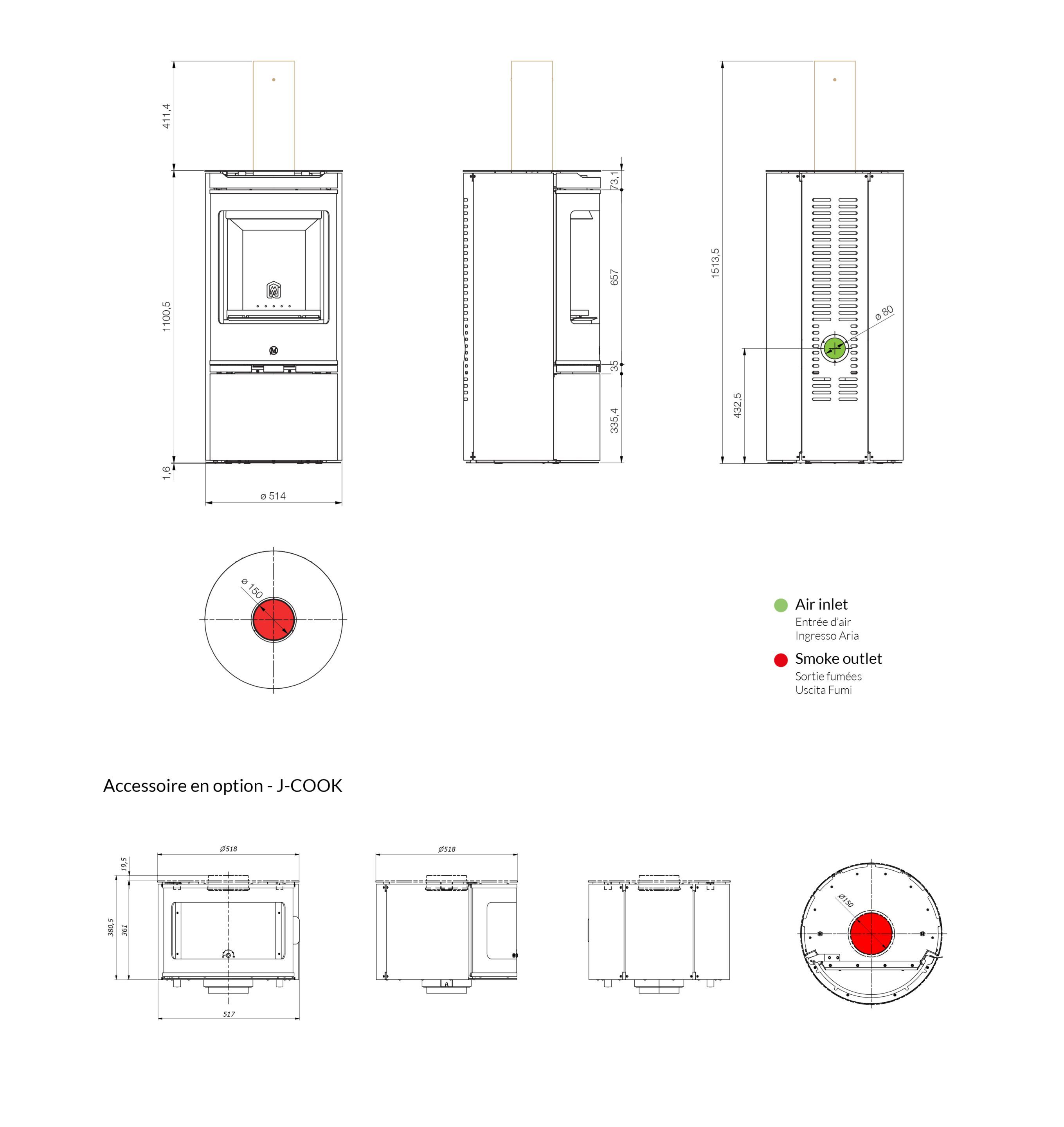 Moderno e pratico, il forno J-COOK permette di cucinare e riscaldare alimenti utilizzando il calore dei fumi di combustione della legna. Il cuore di J-COOK è realizzato in acciaio inox, è possibile inoltre aggiungere un piano tondo in materiale refrattario smaltato per alimenti. Il termometro fornito di serie, permette di visualizzare la temperatura interna. Il design del forno J-COOK rende la stufa adatta a qualsiasi ambiente senza compromessi. J-COOK è disponibile come optional sui modelli CLIPPER e CLIPPER UP.