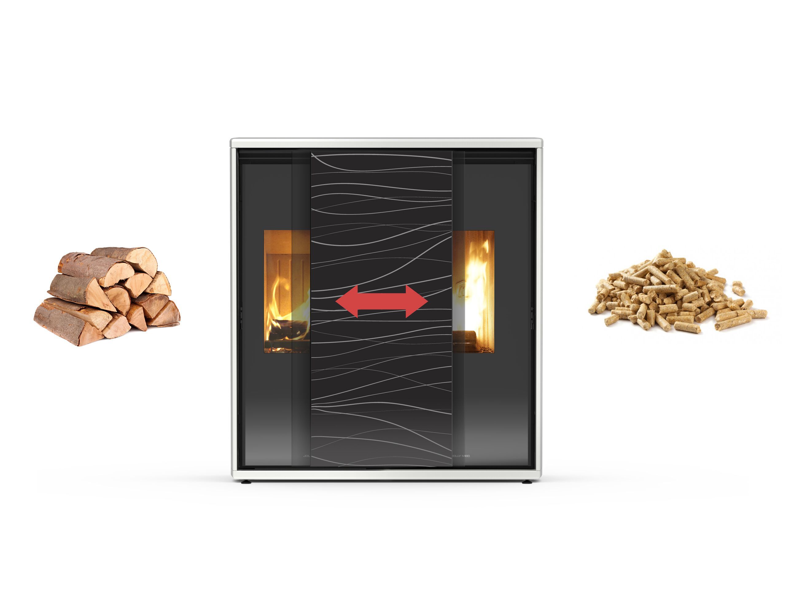 REVERSE S è una stufa combinata funzionante a legna ed a pellet, per il riscaldamento ad aria forzata e canalizzabile. Dispone di due camere di combustione e una sola uscita fumi. REVERSE S è garanzia di un sicuro risparmio, in quanto oltre al pellet, offre il funzionamento a legna che non necessita di energia elettrica. Il sistema brevettato SMART AIR, montato di serie, permette il passaggio in automatico dalla legna al pellet in piena sicurezza. Grazie al suo design unico, REVERSE S si adatta diversi contesti di arredamento. La finitura esterna è disponibile in pietra ollare o acciaio in colorazioni bianco o nero. L’esclusivo vetro esterno scorrevole decorato o liscio, completa l’effetto scenografico della stufa permettendo di oscurare o dare visione della fiamma in qualsiasi momento. Con il funzionamento a legna si può scegliere se riscaldare per irraggiamento o con ventilazione. Per adattarsi alle diverse soluzioni abitative è possibile utilizzare l’uscita fumi più adatta: posteriore o superiore. Wifi di serie per controllo in remoto.
