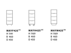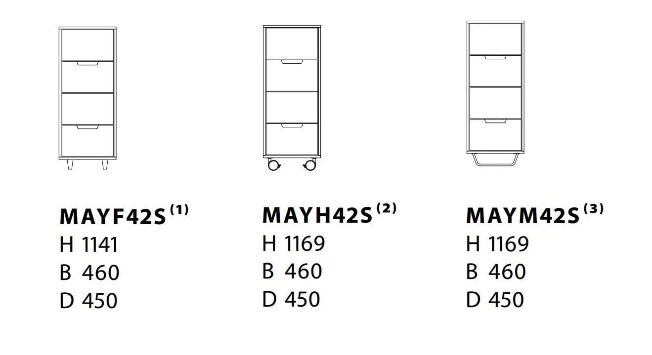 MAY è realizzato in MDF ed è disponibile con impiallacciatura rovere e frassino, colori standard, tinte standard su frassino o rovere smaltato bianco o frassino. Scegli tra gambe in legno massello con viti di regolazione, guide in acciaio con finitura cromata lucida o quattro ruote bloccabili. Il colore delle ruote è in tinta con la cassettiera, fatta eccezione per le versioni in frassino o rovere, su cui le ruote sono sempre bianche.
