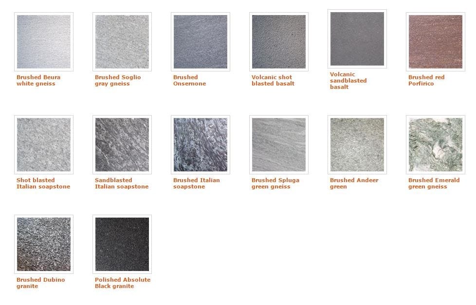 Possibili materiali di rivestimento in pietra: basalto, pietra ollare Italia, beola verde Spluga, beola verde Smeralda, beola bianca Beura, beola grigia Soglio, verde Andeer, serizzo Dubino, granito Nero Assoluto.