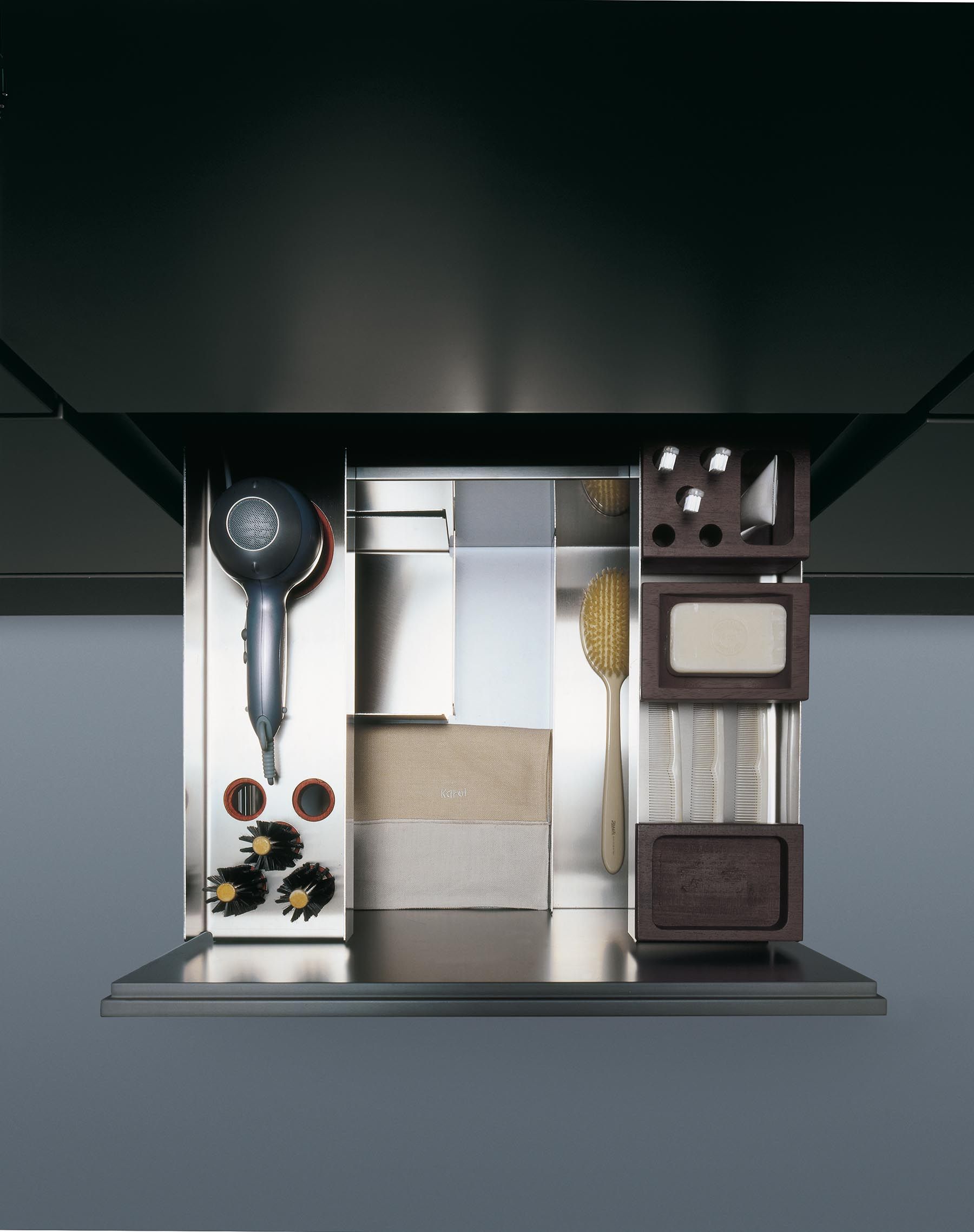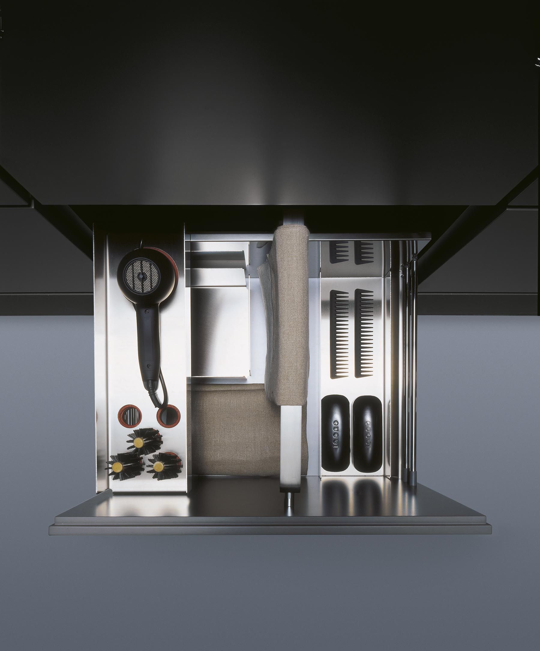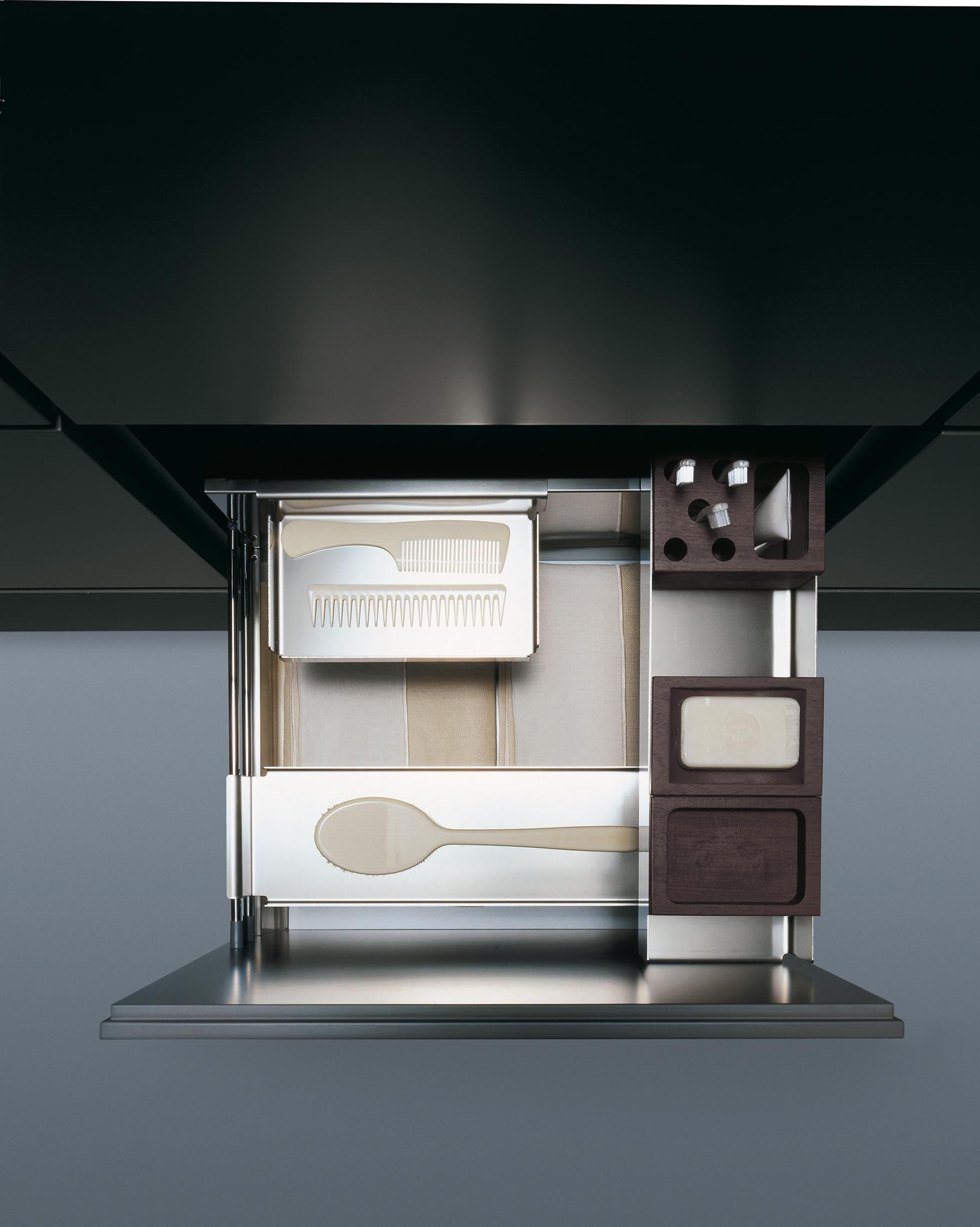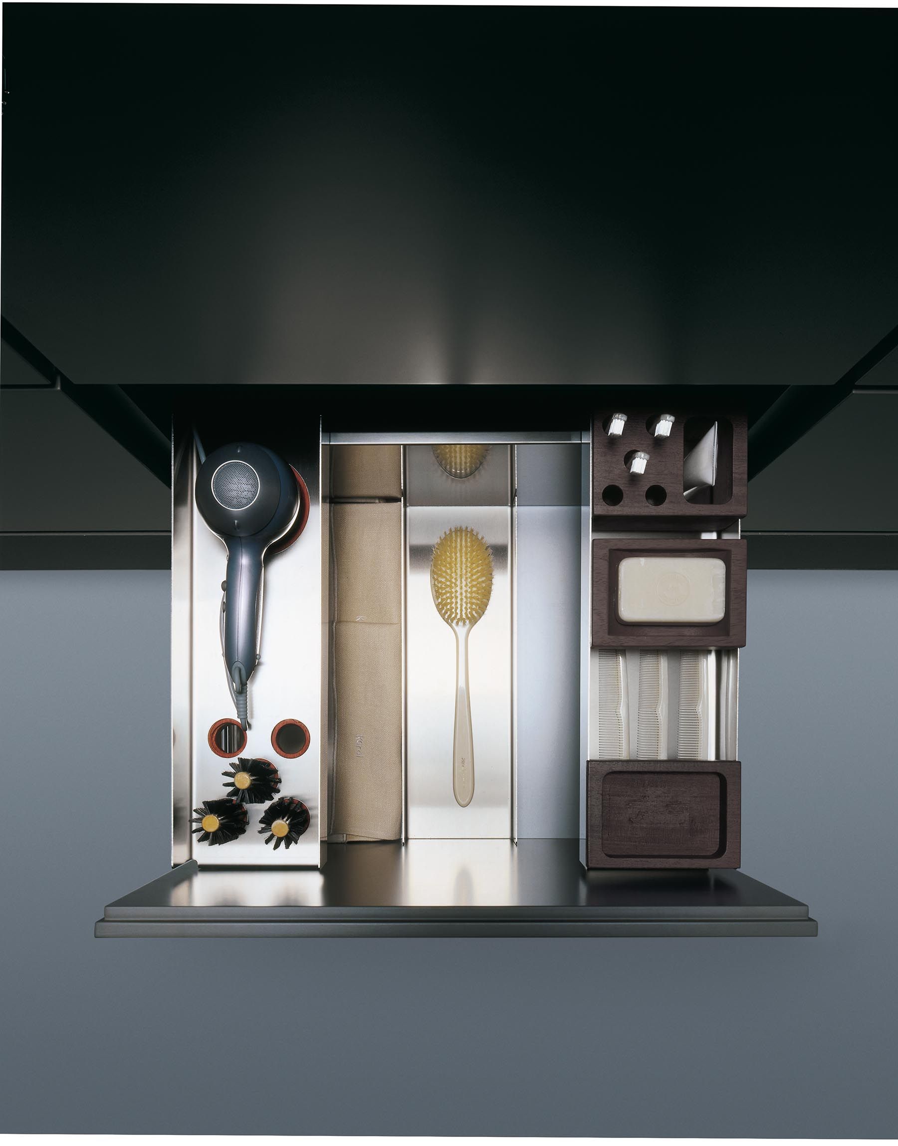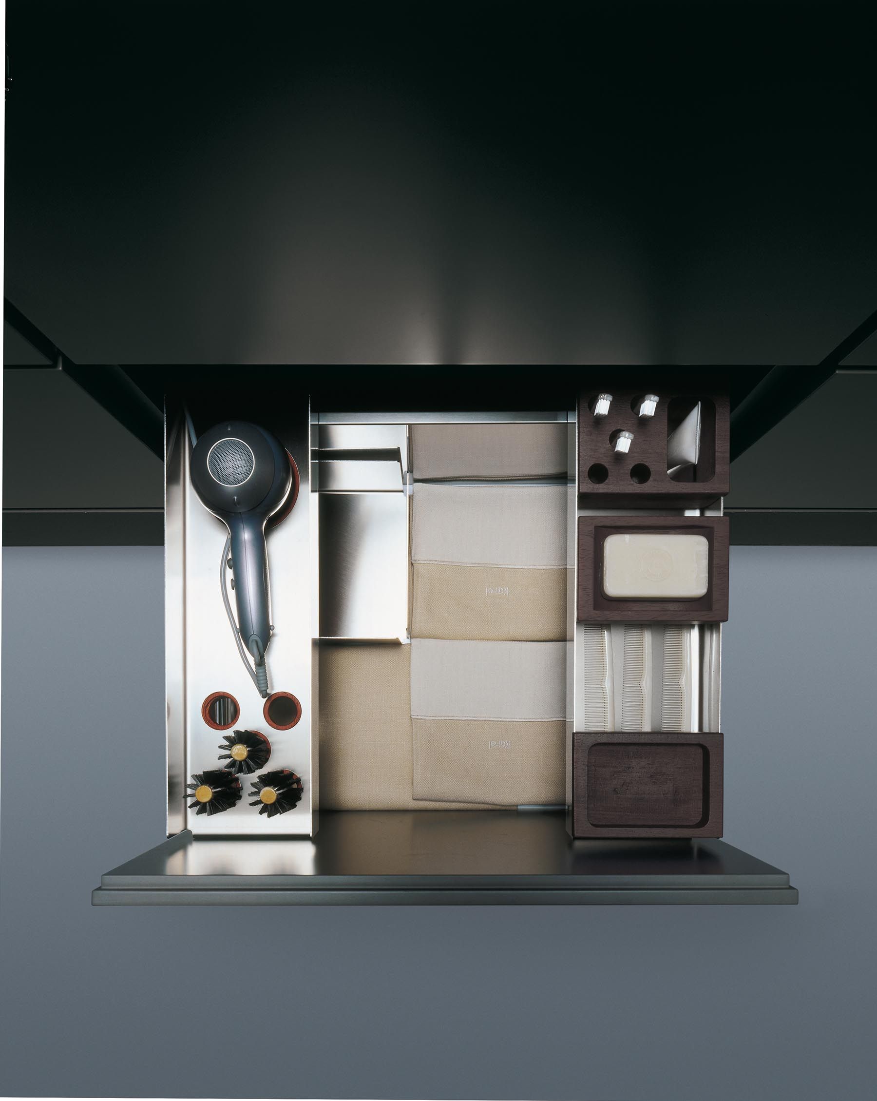 I moduli contenitori possono essere completati con cassetti interni comprensivi di scomparti make-up e di chiusura di sicurezza per farmaci, ma anche con tutte quelle attrezzature necessarie nel bagno (portaspazzolino, portasapone, portaoggetti, cestino, porta-phon, porta salviette e vassoi contenitori).