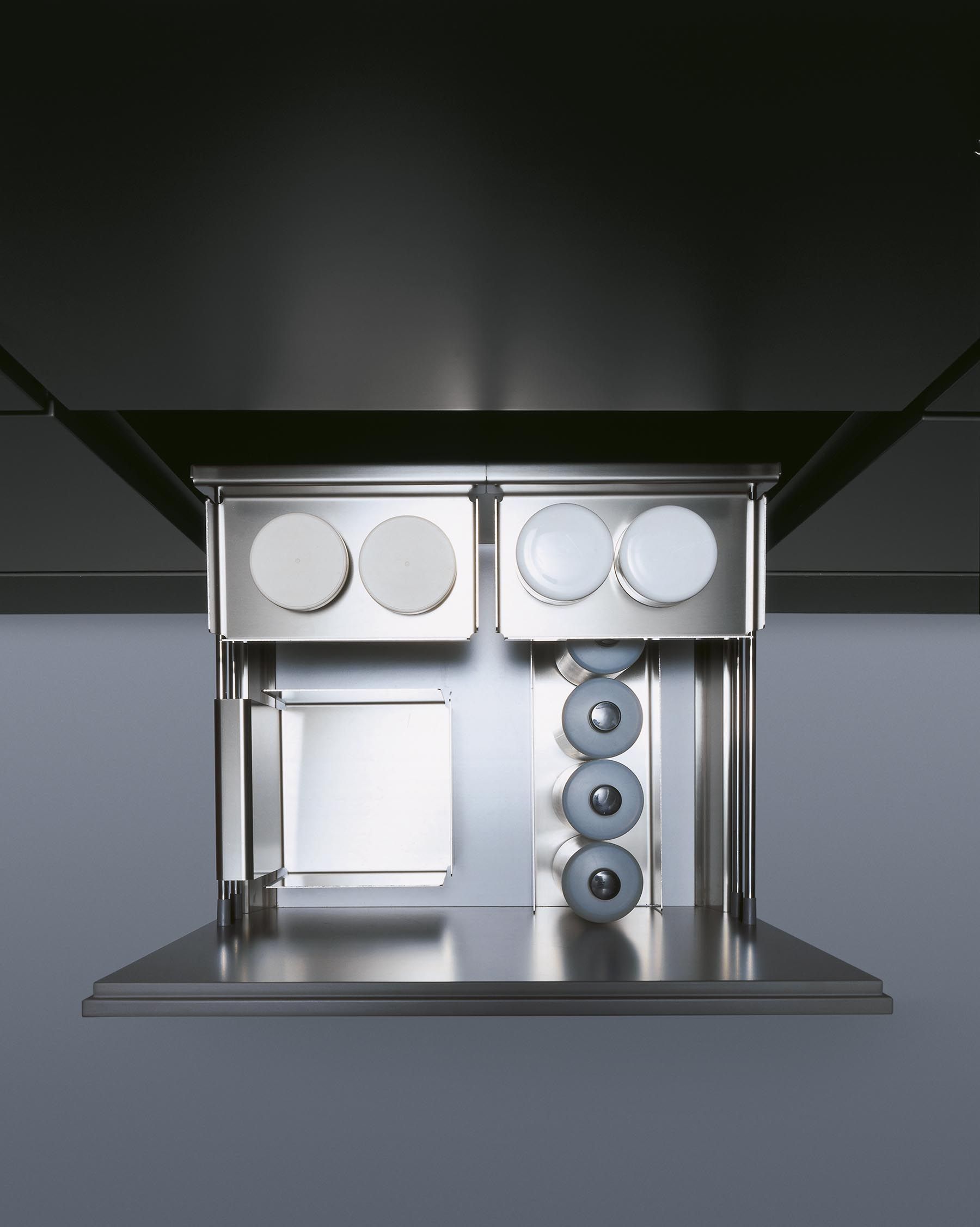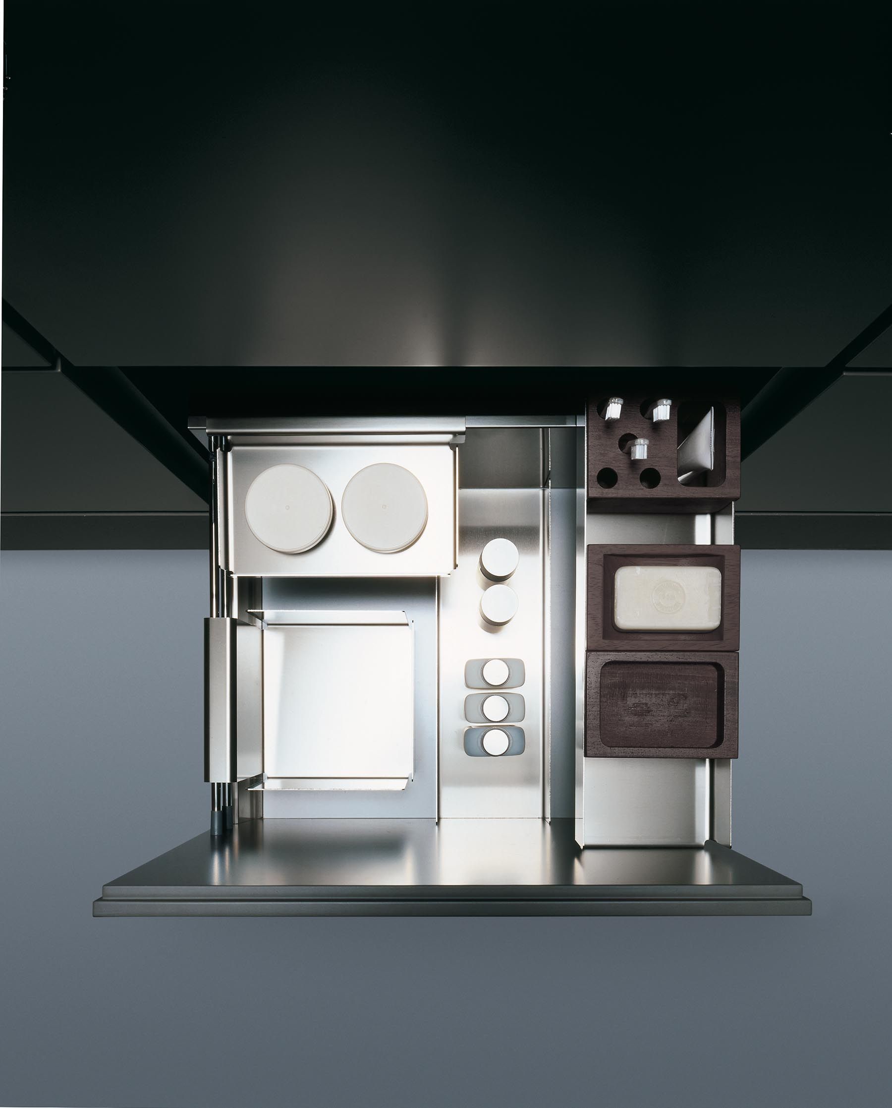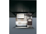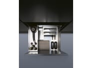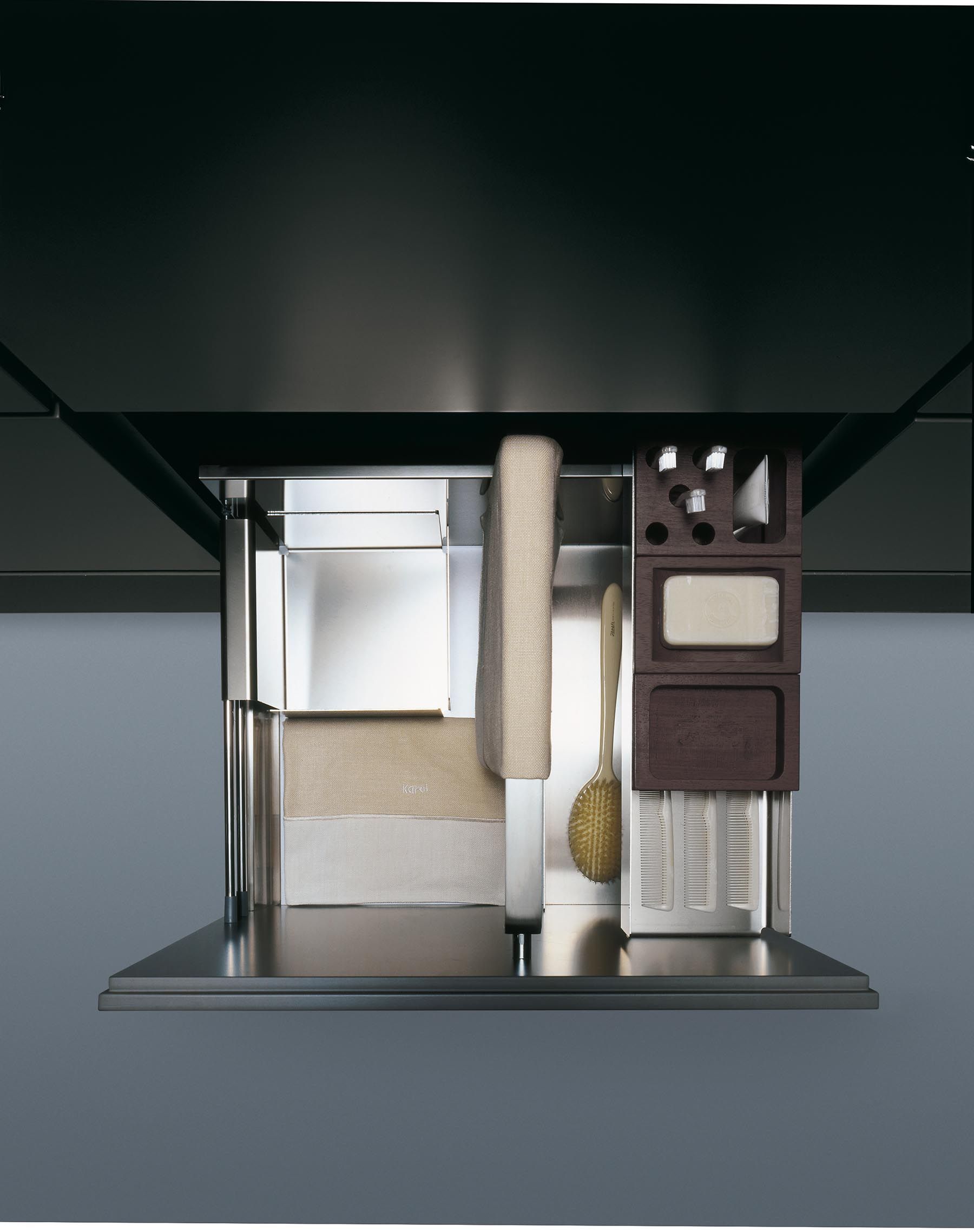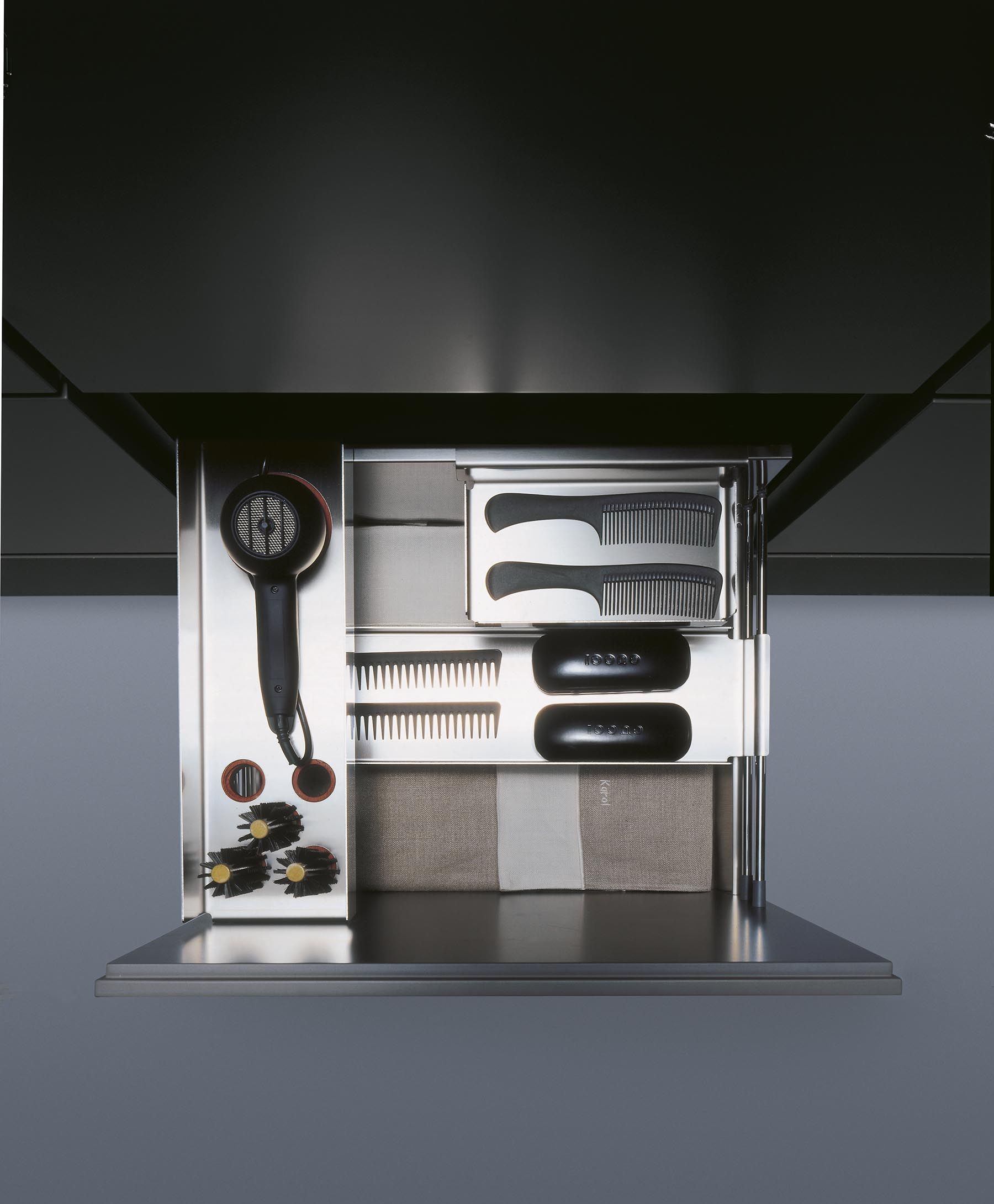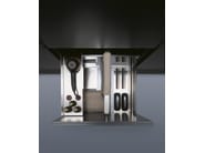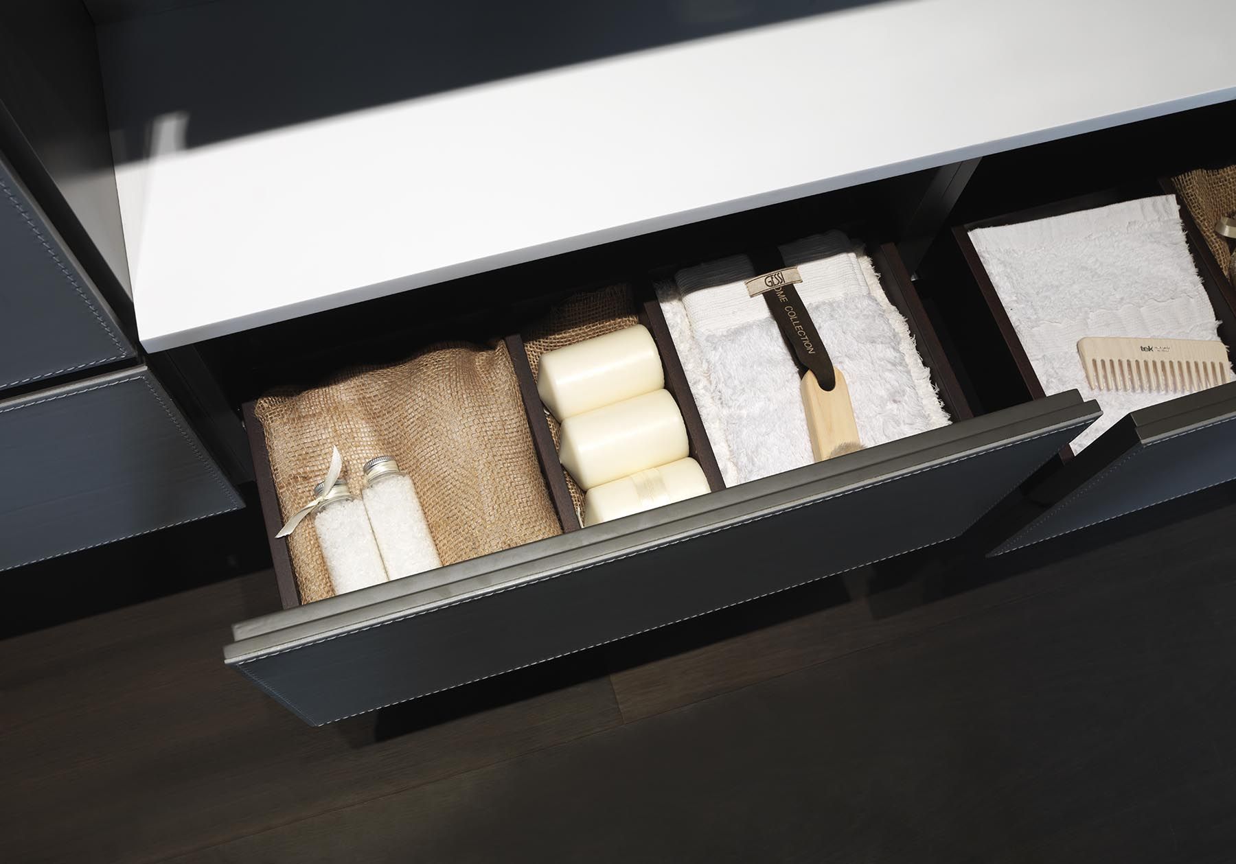 I moduli contenitori possono essere completati con cassetti interni comprensivi di scomparti make-up e di chiusura di sicurezza per farmaci, ma anche con tutte quelle attrezzature necessarie nel bagno (portaspazzolino, portasapone, portaoggetti, cestino, porta-phon, porta salviette e vassoi contenitori).