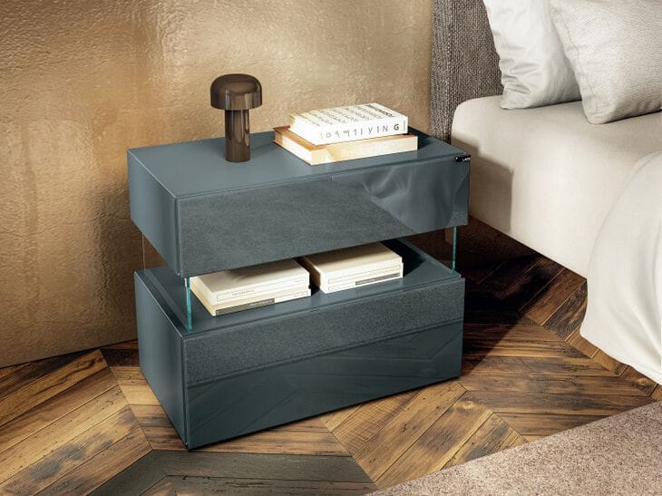 Volumi essenziali sospesi su resistenti supporti in vetro temperato sembrano fluttuare nell’aria, regalando una sensazione di estrema leggerezza nella zona notte. Grazie alla modularità del design, i comodini con cassetti Air sono progettabili su misura per ogni esigenza di spazio ed essendo una soluzione free standing, possono essere posizionati al centro della camera da letto. Lavorati finemente con filigrana in alluminio e profilo a 45°, i comodini Air presentano una qualità costruttiva unica per garantire resistenza nel tempo.
